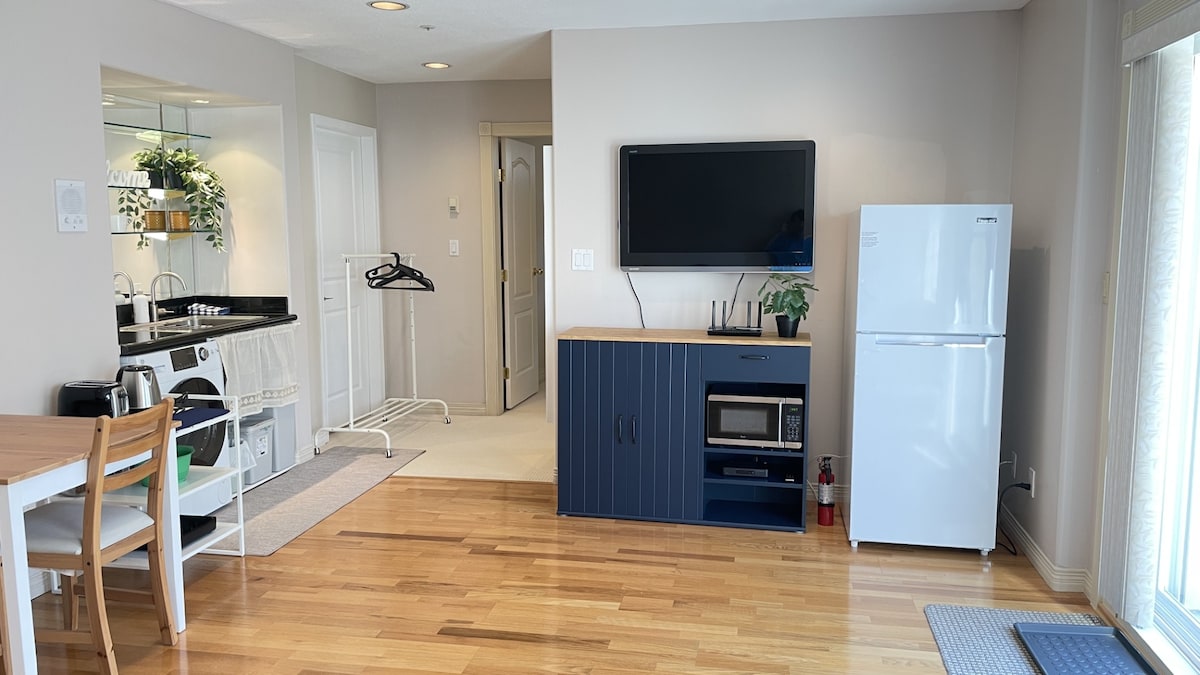 Private entry & space : 500 square feet ( Nothing is shared with anyone ) with a quiet neighbourhoods. Stay includes: ▩ Fun: LG 4K OLED TV + Apple TV + 4K Netflix + Marshall speaker + 1 Gbps WIFI ▩ Hot: Air Conditioner + Dyson fan ▩ Cold: Floor heat + Nest thermostat ▩ Bar: Microwave + Fridge + Nespresso + Starbucks capsules + Water Filter ▩ Clean: 2 in 1 LG Dryer/Washer + Toto washlet + Sanitizer ▩ Commute: 7min walk to restaurant/bike lane/walk to transit. 20min drive to YVR / Downtown