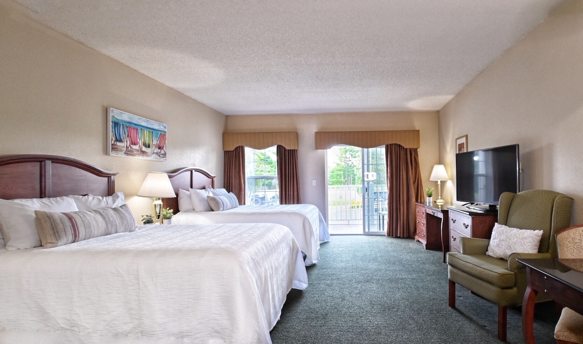 The Junior Suite offers a spacious and comfortable stay, featuring a separate sitting area and a well-equipped kitchenette with a refrigerator for added convenience. Guests can enjoy modern amenities such as air conditioning, heating, an LCD TV, and blackout drapes/curtains for a restful atmosphere. The suite is furnished with plush pillowtop beds and includes one bathroom. Accommodating up to four guests, it features two Queen-sized beds, making it an excellent choice for families or small grou