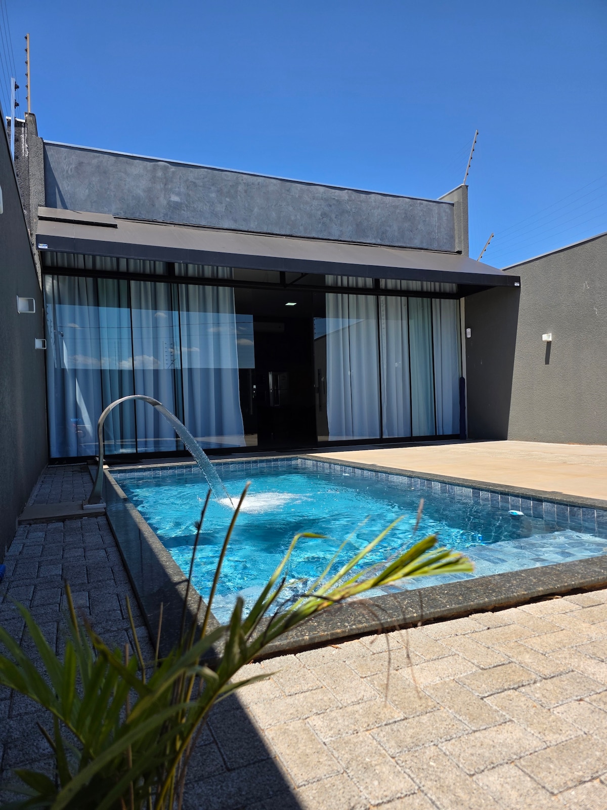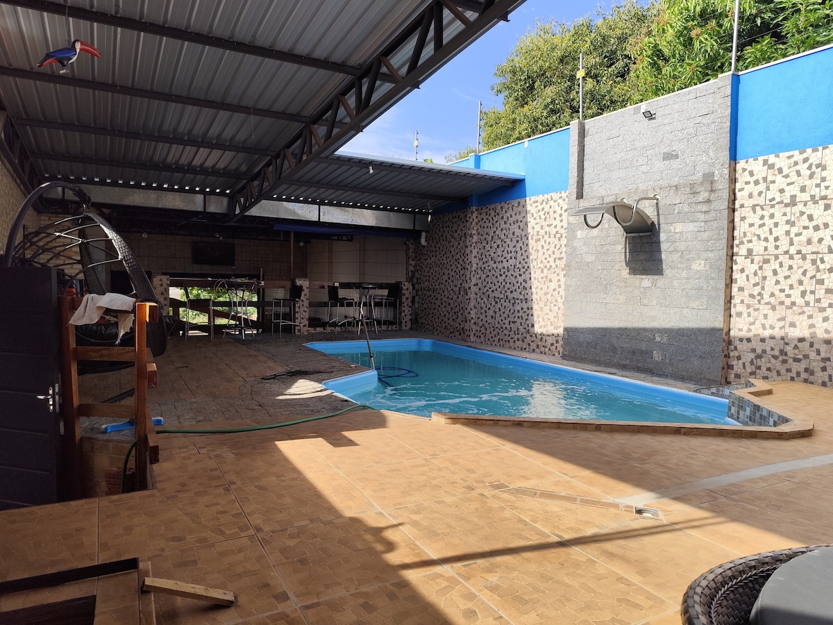 Casa localizada no bom jardim, com piscina aquecida (aquecedor solar, depende de vários dias de sol para de manter aquecida, portanto, não é garantida a temperatura). Tem cozinha ampla, com ilha e todos utensílios necessários para o preparar de um jantar incrível, churrasqueira integrada ao ambiente. 01 banheiro externo (piscina) e 01 banheiro interno, ao lado de um quarto, com cama de casal, mais outro quarto com cama de casal, 01 cama de solteiro e mais 01 colchão de solteiro Sofá na sala.
