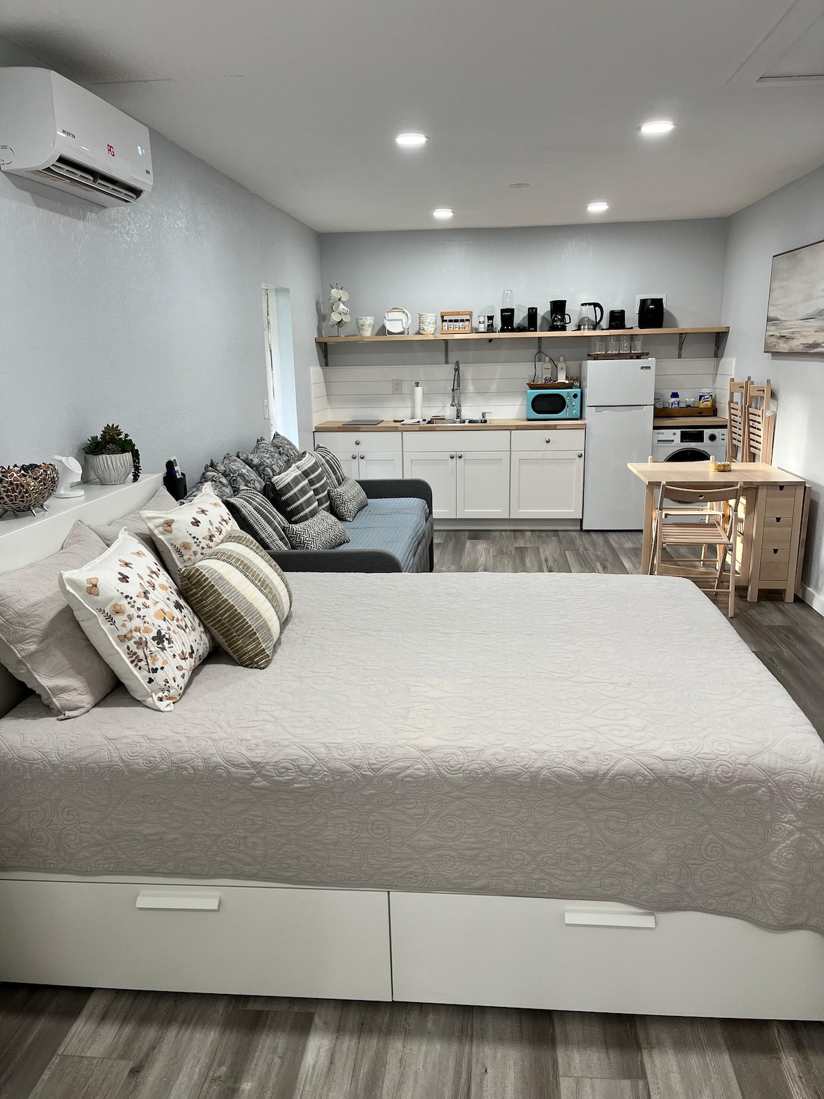 Discover our cozy mother-in-law suite in Ocala! This charming space offers a comfortable bedroom with a king size mattress, spacious living room with sleeper sofa, full kitchen, bathroom, and a sunlit sunroom featuring a functional claw foot tub. Perfect for a cozy and relaxing stay.