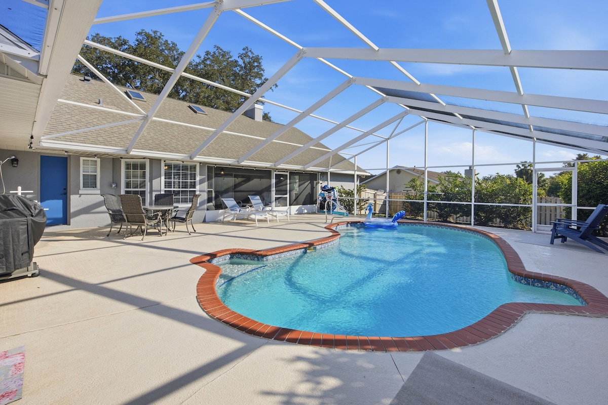 Welcome to your Ocala getaway where open spaces, easy gathering spots, and year-round fun create a comfortable stay for families, friends & pups. - Sleeps 9 | 3 bedrooms | 5 beds | 2 baths - Private pool (not heated, open all year) - Detached game room w/ pool table & arcade - Screened lanai w/ dining & outdoor seating - Kitchen, laundry & workspace - Pet-friendly