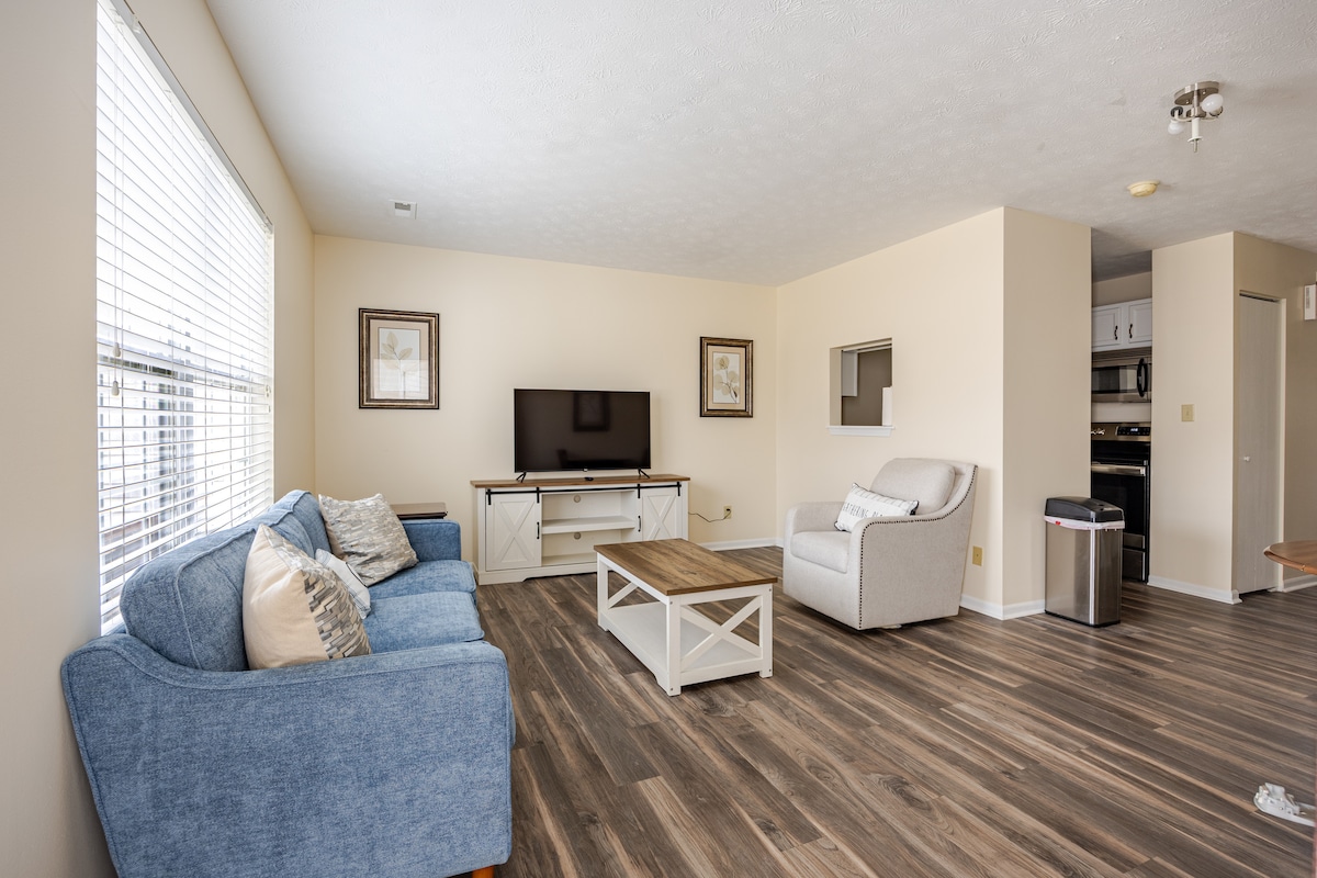 As a Guest Favorite and hosted by 4.8+ Superhost, this charming 2 bedroom townhouse in the heart of Speedway offerst the perfect blend of cozy comfort and unbeatable location. Relax on the spacious front porch and feel right at home in this classic blue beauty-ideal for race fans, families, and Indy explorers. Step inside a bright, inviting living area with comfy seating, streaming TV and fully equipped kitchen while the dining area is for gathering. Review our house rules prior to booking! 😊
