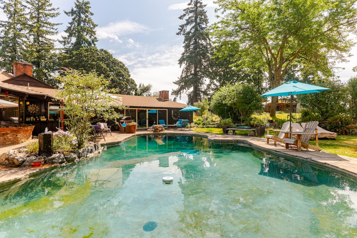 Cozy 1947 home w/real wood burning fireplace for winter, and A/C for summer, Dining room seats 6 & Large windows overlooking old growth oak trees. Peaceful backyard, offering 3 different bbq grills, hammock underneath 2 beautiful maple trees, nice HOT TUB under covered area, real wood fire pit in yard, table w/umbrella to eat at, & ping pong table offered in the summer, 5minutes from the Willamette River & downtown shopping/restaurants/parks. Central to Portland/Detroit Lake/Oregon coast.