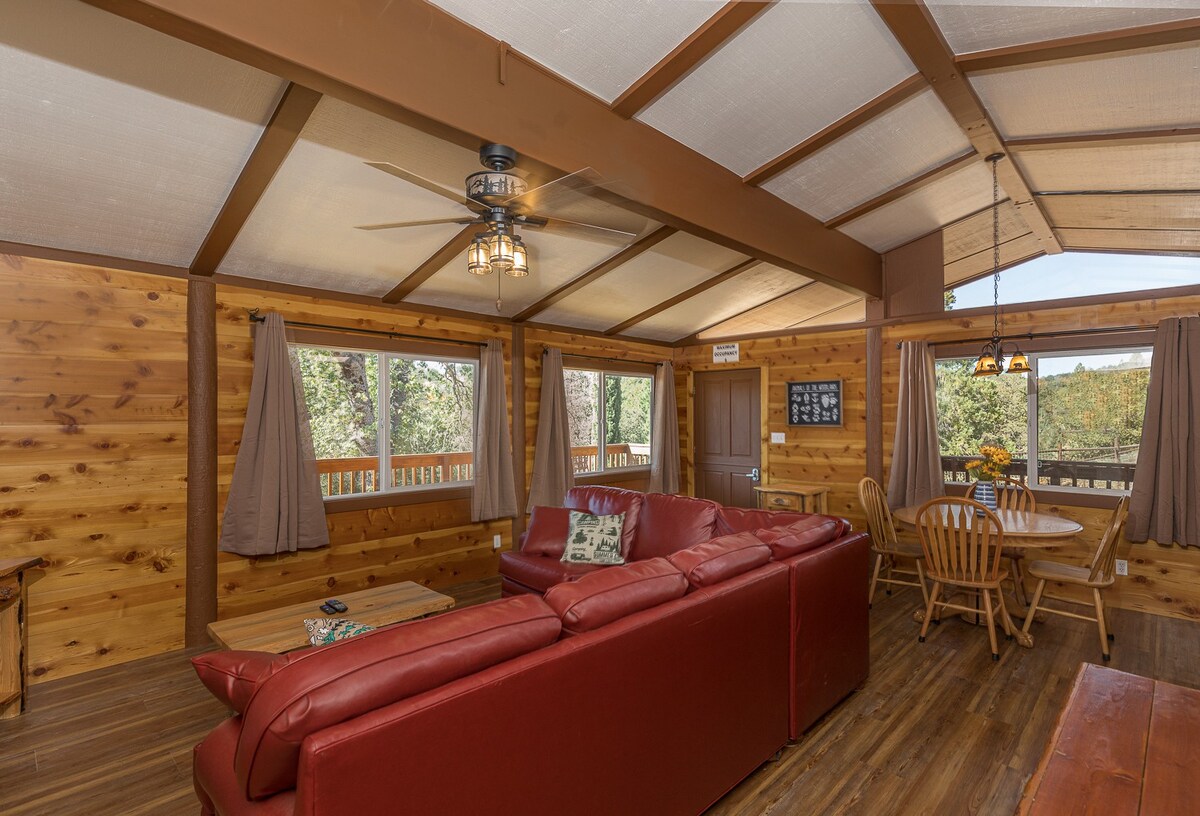 - 2 bedrooms 1 bath cabin with game room in the family room - queen size sofa bed in the family room - infant and toddler friendly - 1 dog per stay - 20 min to Yosemite South Gate entrance - 9 min to Bass Lake - 10 min to downtown Oakhurst - 4 person hot tub - fully fenced in deck and hot tub area - Note: children's bedroom wall is open on top and noise may travel. ** we provide firewood for our indoor fireplace**