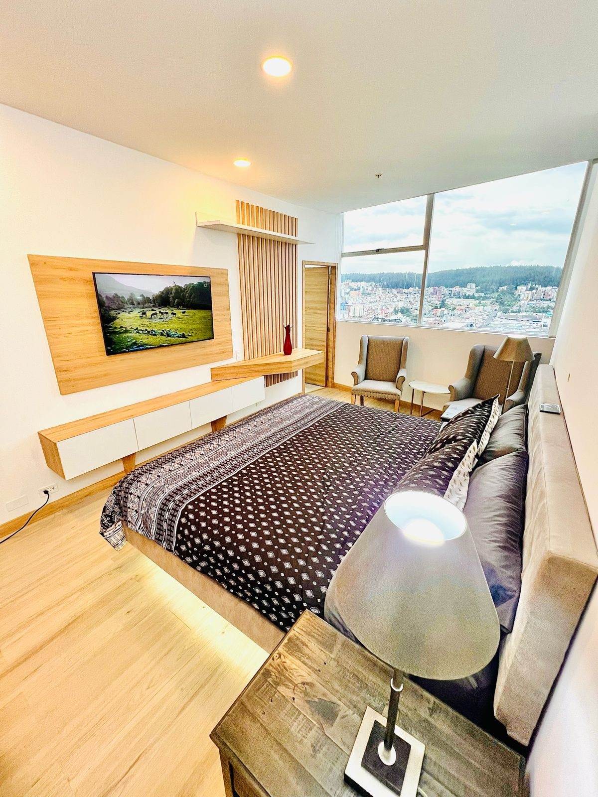 Moderna mini suite totalmente independiente, con una fantástica vista panorámica de Quito. Ubicada en el mejor sector de la ciudad, La Carolina, el corazón del Quito moderno. El Edificio incluye piscina, jacuzzy, sauna, turco, gimnasio, área de coworking y servicio de lavandería. Contamos con Netflix y WiFi de alta velocidad.