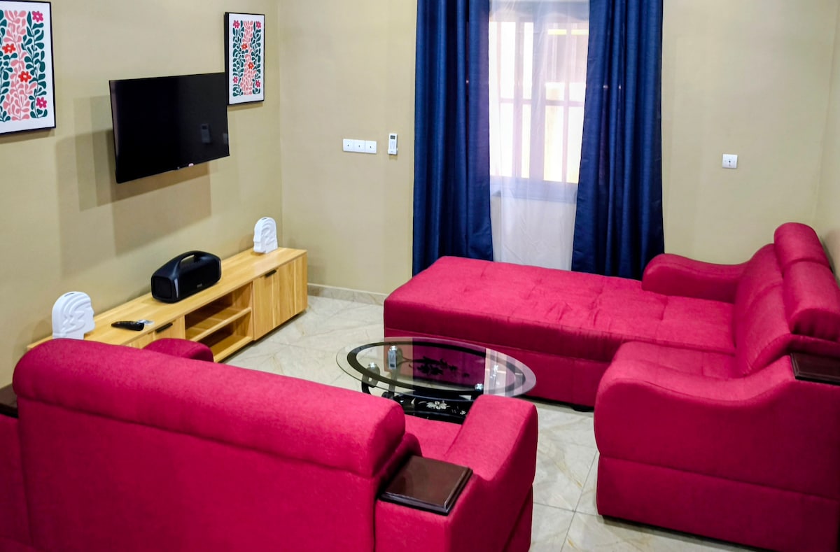 Profitez d’un style contemporain avec une belle harmonie entre modernité, confort et chaleur. Cet appartement, situé à Baguida, un quartier côtier prisé de Lomé réputé pour son ambiance paisible et ses belles plages de sable, parfaites pour les balades ou les moments de détente. Le logement bénéficie d’un emplacement pratique, proche des commodités, restaurants, supermarché, banques. Wifi, Netflix, Climatisation, Draps, Serviettes, Ménage. NB : l’électricité est à la charge du voyageur