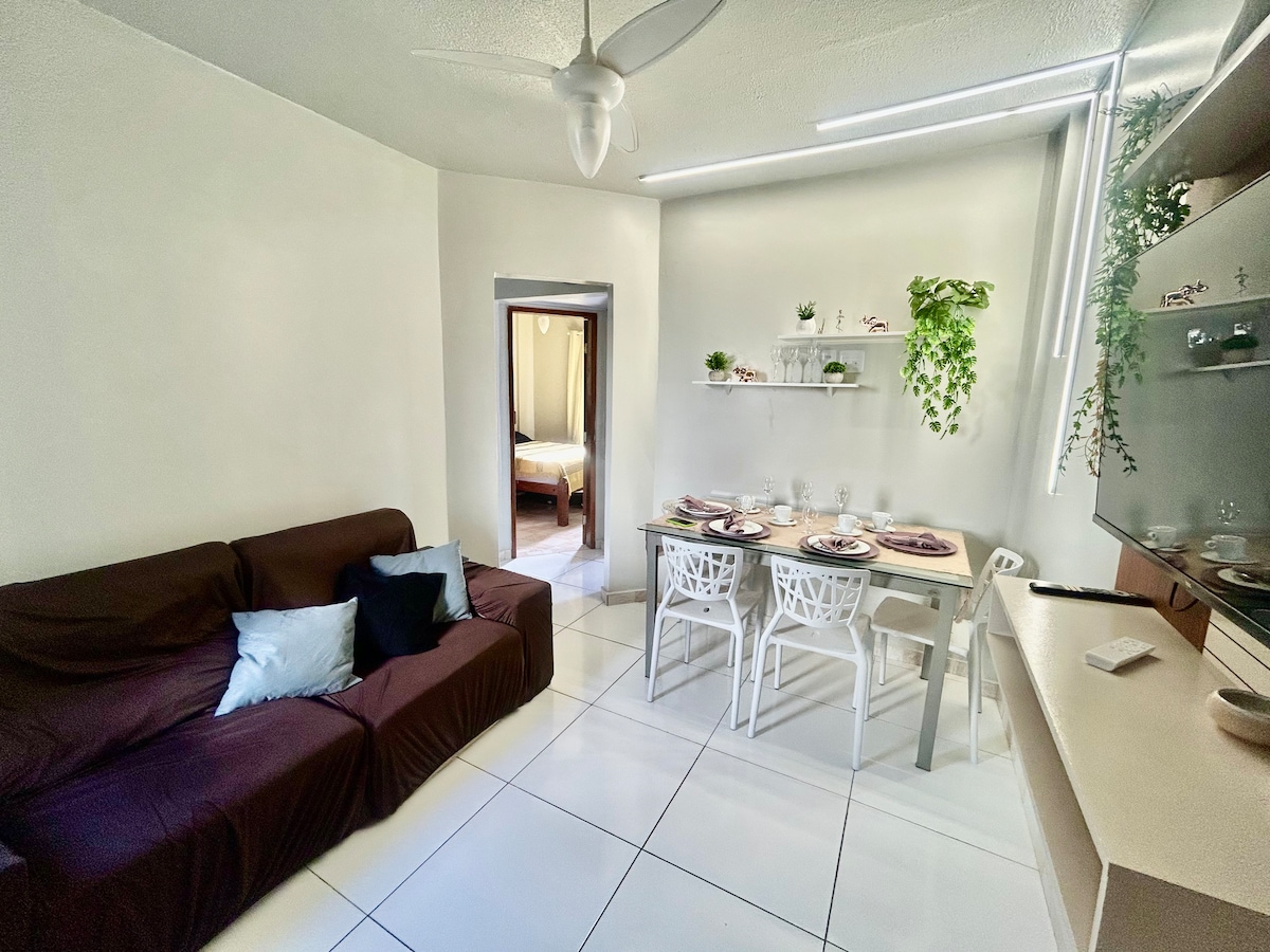 Abrace a simplicidade e o aconchego desse lugar tranquilo. Apto com 2 quartos; casal com cama box, ar condicionado, guarda roupa, cômoda; solteiro cama, ar bancada. Sala c/ TV, sofá e mesa de jantar. Cozinha c/ geladeira, fogão, liquidificador, grill e utensílios. Banheiro box brindex chuveiro elétrico . Estacionamento privativo. Condomínio fechado, câmaras de segurança, cerca elétrica e portaria. Área de lazer: 2 piscinas, parquinho, área gourmet, quadra, churrasqueira e salão de festas.