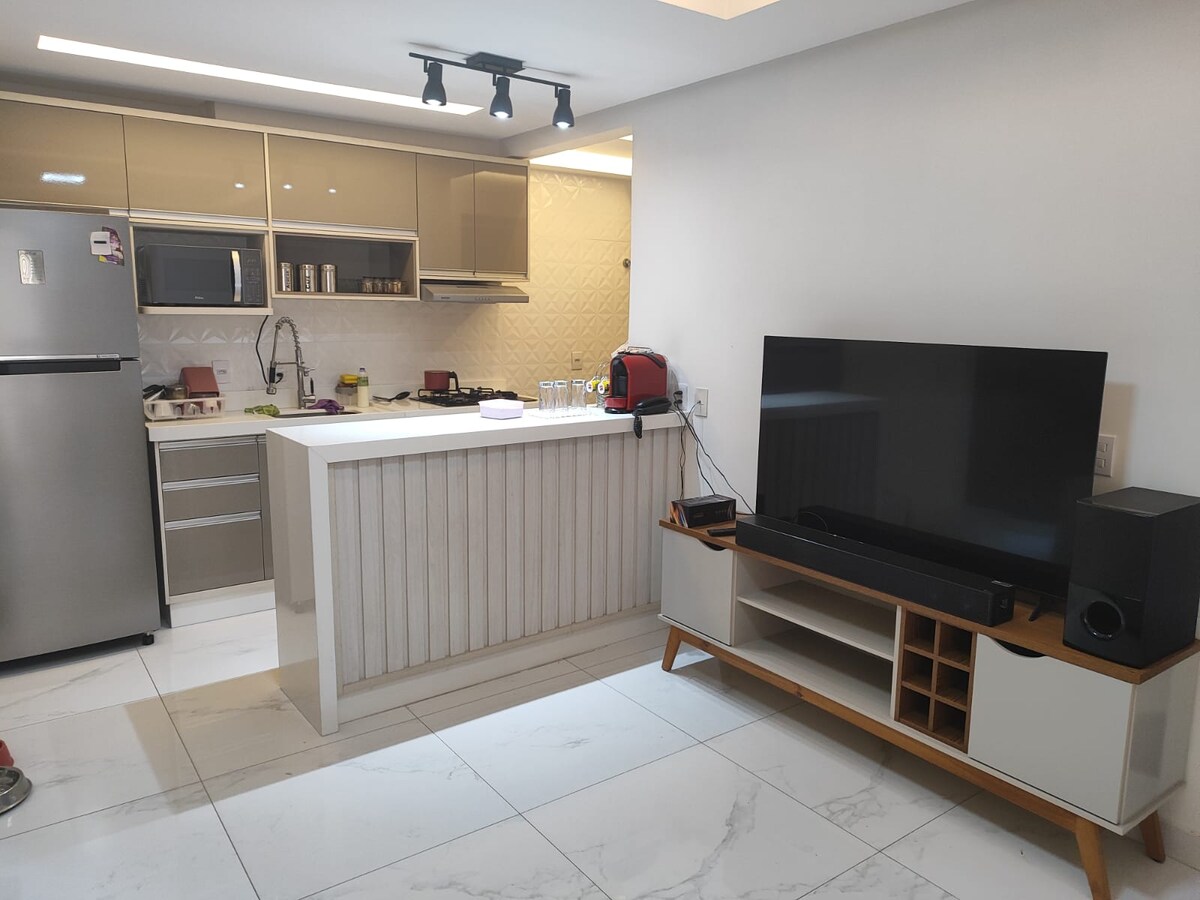 Apartamento completo e bem equipado, possui cozinha com geladeira, cooktop, forno, microondas e máquina lava e seca. Com dois quartos, sendo uma suíte. Suíte com uma cama de casal e o outro quarto com uma bicama. Banheiro social. Localização estratégica, próximo de farmácias, restaurantes e supermercados. Condomínio com área de lazer completo com piscina e academia. Estacionamento privativo com uma vaga de garagem.