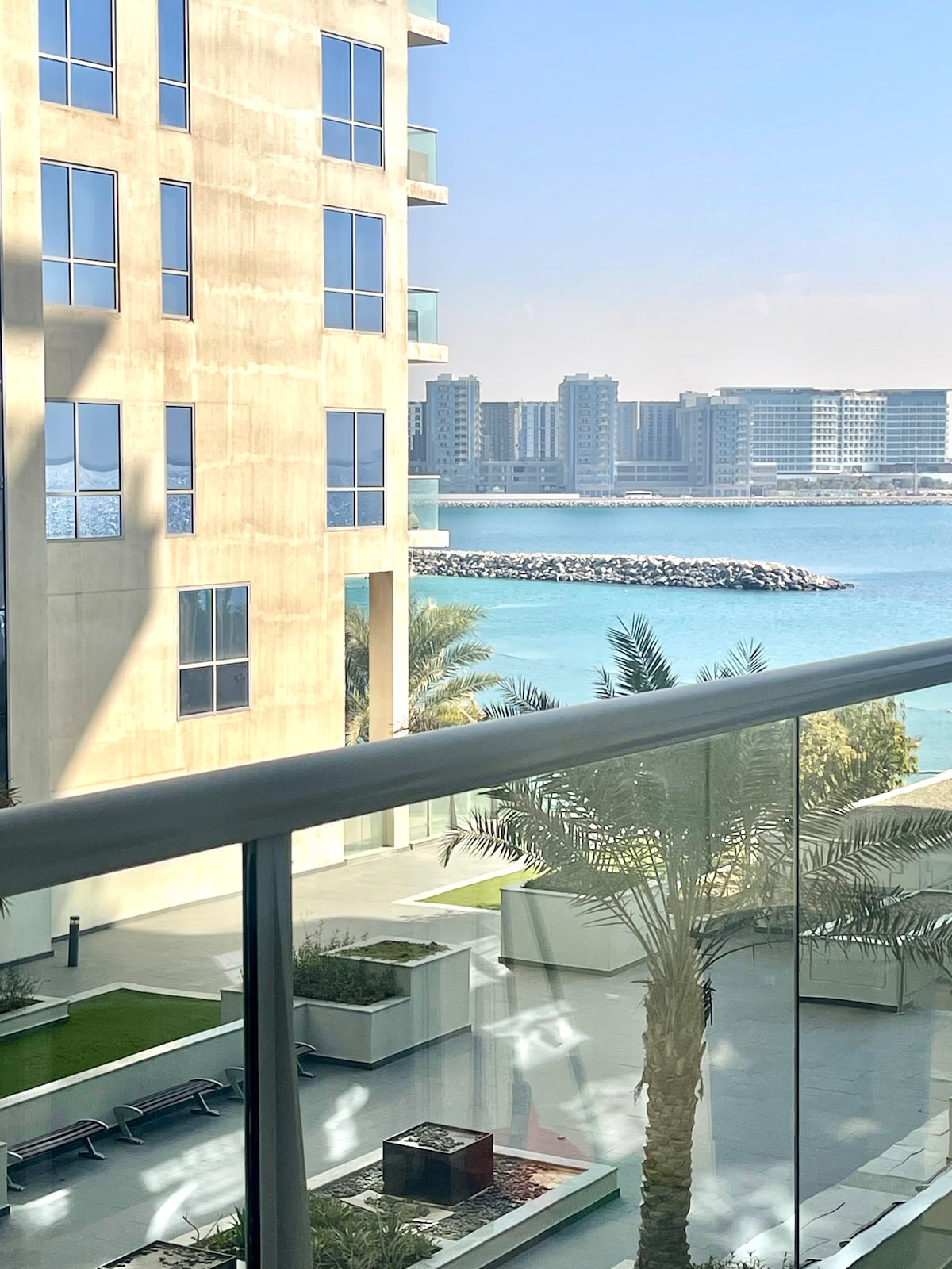 Take a break and unwind at this peaceful space while taking in the beautiful waters from the balcony. Studio close to free Beach, Golf course, Marina and luxury hotels: Ritz Carlton, Waldorf. 20min drive to the Hajar Mountains, 5min to Alhamra. Lockbox access. Parking, Pool, play area. Full sea view from balcony. Sleep: King size bed+Kitchen: cooker, w/machine, Fridge, Dolce Gusto, toaster. Other: Wifi, Smart TV, 24/7 market/cafe. Walking distance to restaurants, Sailing and Yacht Club.