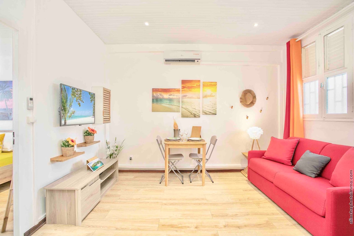 Nice flat , entirely equipped located in town center with 1 min of the market LOCAL and 5 min of the stars for the Trois ilets. Air conditioning in the living room and in the room, Wifi, HD TV Apartment for 4 people + baby (1 DOUBLE BED + 1 SOFA BED with True Mattress + 1 BERCEAU) Included are sheets, blankets, 1 range of cosmetics, towels and. Fort de France Bay beach is a 10-minute walk away.