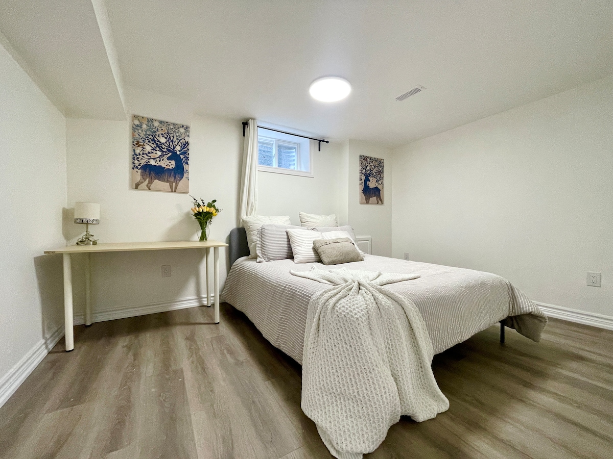 Welcome to your stylish urban retreat! This contemporary basement apartment is designed for comfort and convenience. Relax in the open-plan living space, featuring cozy seating and a smart TV. Enjoy a modern kitchen with stainless steel appliances, including a fridge, stove, microwave, and coffee maker. The private bedroom has a king-sized bed with premium linens and ample storage space. Situated in a vibrant neighborhood, you’ll find trendy cafes, shops, and parks just a short walk away.
