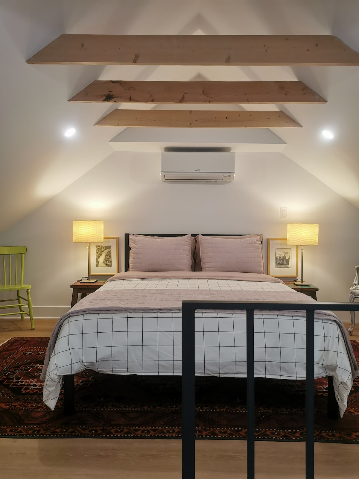 This separate, minimalist, self-contained coach house is a perfect quiet escape for one, and can also intimately accommodate two persons. Wake up in natural light with all the essential home comforts: premium queen-size mattress, hypoallergenic, 100% cotton linens, a private bathroom, toiletries and meal preparation basics. No kitchen. Nearby options for prepared meals, groceries + delivery. No TV. No housekeeping fees. A 20-minute getaway from the downtown core near the lake in the east end.