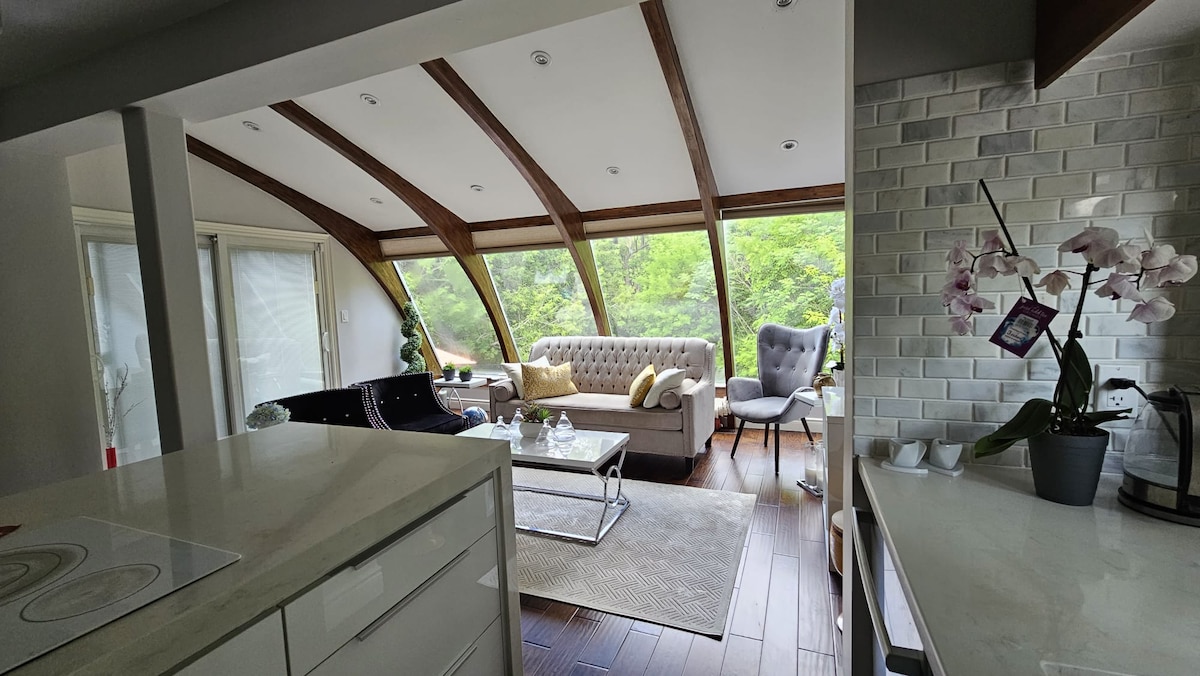 Welcome to the LOFT - A private, eclectically designed spa-inspired unique stay in the historic Webb Schoolhouse, less than an hour from Toronto. Featured in TORONTO LIFE in 2021, this private loft includes a sauna, unique hanging bed, wood stove, kitchenette and is filled with art, and huge tropical plants as well as a projector & giant screen for epic movie nights. Relax and recharge, roam the grounds and enjoy the beautiful outdoor spaces, the permaculture farm, animals, and fire pit.