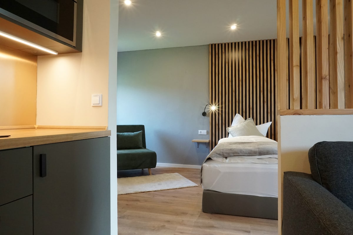 Living in a Gründerzeit house: Unique, cozy & a bit more beautiful! The modern loft apartment is located in a beautiful Gründerzeit house in the Hof city center. Pedestrian zone and train station are each only a few minutes walk away. The loft has a kitchenette, a queen-size bed, an en-suite bathroom with a free-standing bathtub as well as a floor-level shower. The ceiling spotlights can be adjusted in color to create an individually cozy ambiance for bathing.