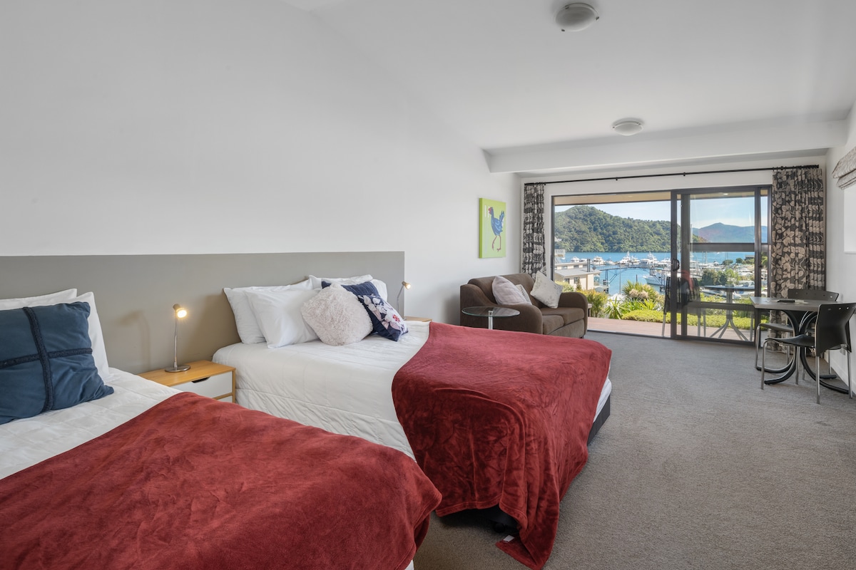 Picton Yacht Club Hotel, 3 Bedroom Penthouse Apartment, Large full kitchen and living room. A home away from home. Overlooking our pool with panoramic views of Picton Harbor. The Penthouse Apartment has One Master Bed room with King Split Bed, One Queen size room with a King Split bed and one single bed room with 1 Small Single Bed with a toilet but no shower attached.