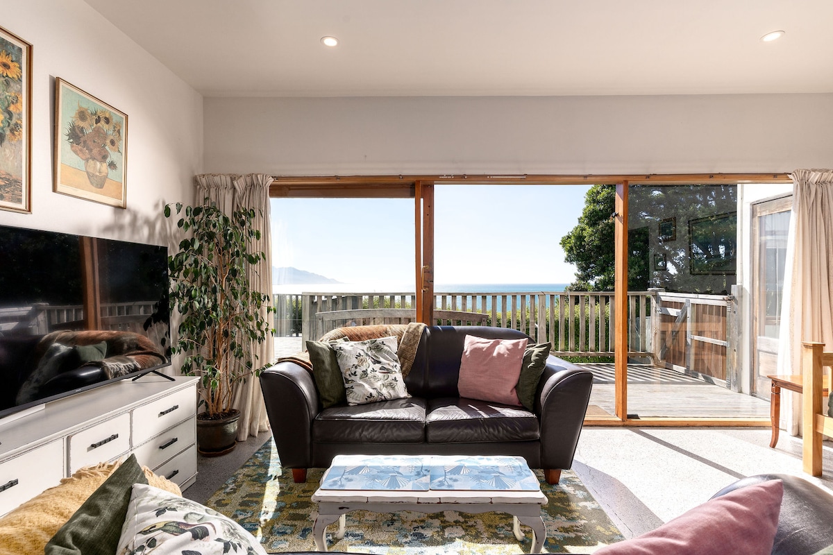 Absolute beachfront, comfortably sleeping 8. Free Wi-Fi and 2 Kayaks free for guest use Enjoy our lovely seaside bach, a warm microclimate situated in the beautiful Golden bay. Relax on the deck and enjoy a summer BBQ with friends and family, light the fire and snuggle up in winter. Our house is so close to the sea listen to the waves from your bedroom! Beautiful beach safe for swimming, dolphins, kayaking, walking & fishing! An idyllic place to rest, relax & unwind.