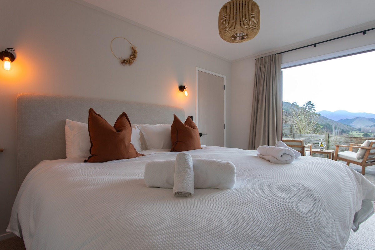 Black Mountain is nestled in the foothills of the Kaikōura Seaward Ranges, 6 km north of Kaikōura township. Designed for short and longer stays, the home is private, peaceful, and set in a beautiful rural landscape. The bedroom, living and dining spaces, bathroom, and deck enjoy mountain and garden views, with glimpses of the ocean from the grounds. On arrival, you’ll find a small selection of freshly prepared provisions — enough for a simple breakfast or two, with our compliments.