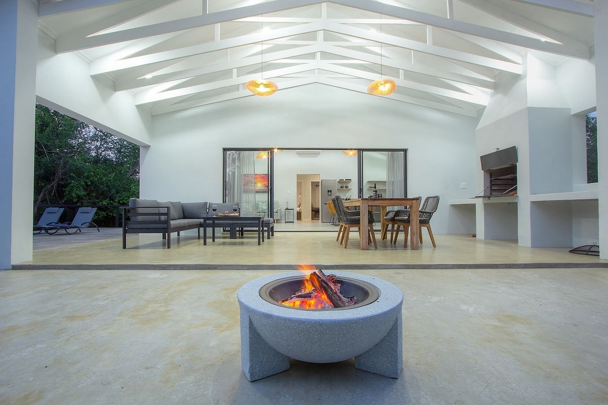 Completed in 2023, this little bush house is a very special open-plan, self catering space, set in a wildlife sanctuary approximately 14kms from the entrance to Kruger. It's a little bit of luxury with a 3mx3m 'deep enough to jump in' splash pool. Relax on the elevated patio surrounded by trees or sit inside with the huge sliding door open and watch the wild animals that visit - kudu, zebra, giraffe, impala, warthog, to name a few, roam freely. Or, just come for a romantic getaway!