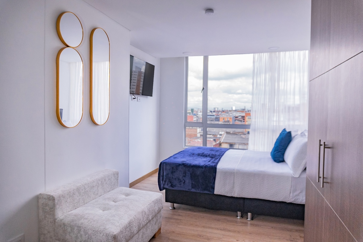 💫Vive la experiencia IVIN 567! Alójate en un moderno loft en chapinero y disfruta de increíbles zonas comunes: gimnasio, terraza con vista, coworking, lavandería y zona de comidas. 🛏️ El moderno apartamento cuenta con todo lo que necesitas para tener una estadía cómoda y agradable: cama doble para dos personas, wifi, TV, escritorio, cocina equipada, sala y baño con agua caliente.