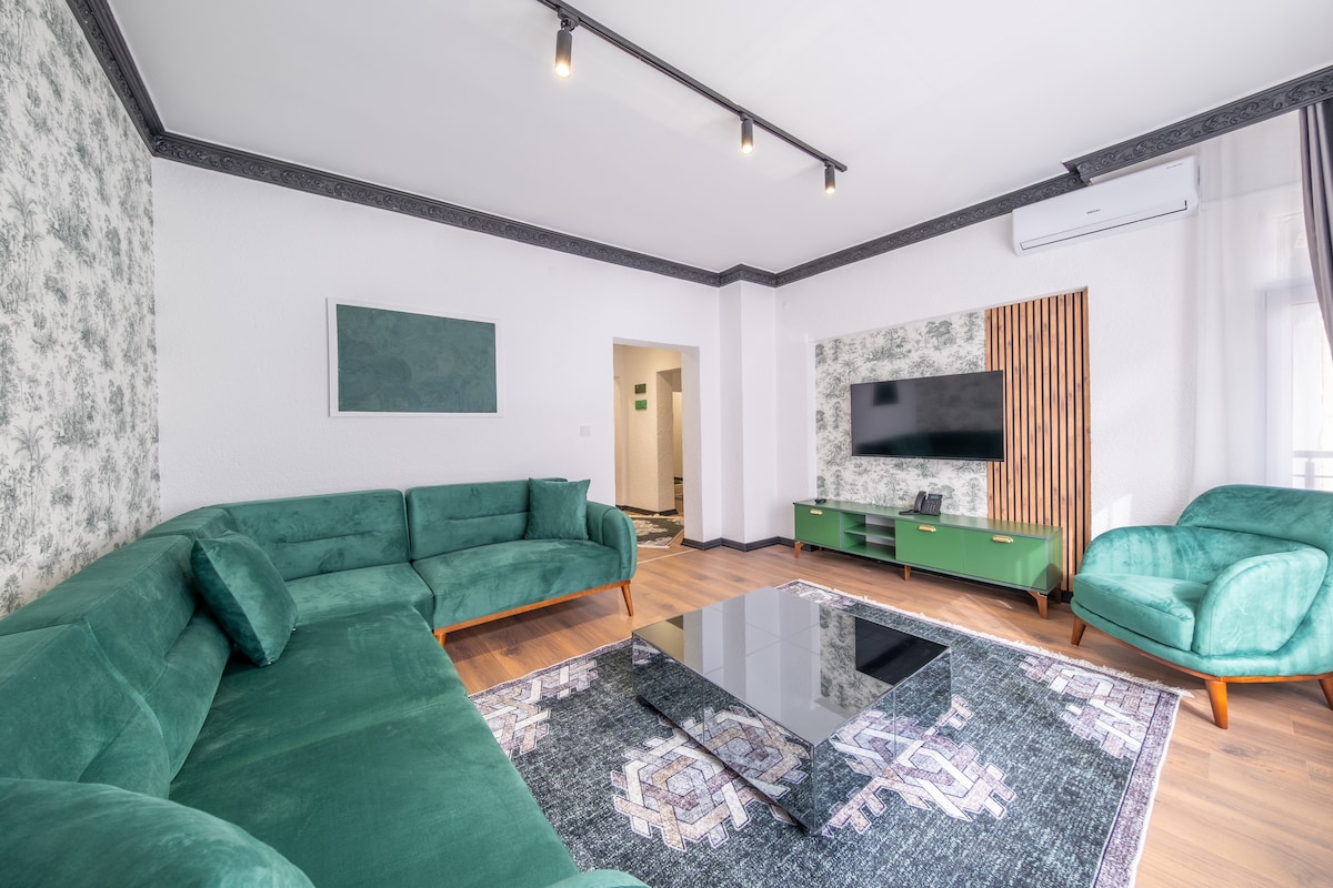 This unique apartment is in our modern boutique hotel in Ortaköy, Istanbul, just a 2-minute walk from Ortaköy Coast, the iconic Bosphorus Bridge, Ortaköy Mosque, and popular kumpir and waffle shops. It features a spacious bedroom, a living room, and a private backyard garden fully furnished for outdoor relaxation. With two air conditioners, a fully equipped kitchen, a washing machine, and a 40-inch TV, the luxurious and modern design ensures a comfortable stay for two guests.