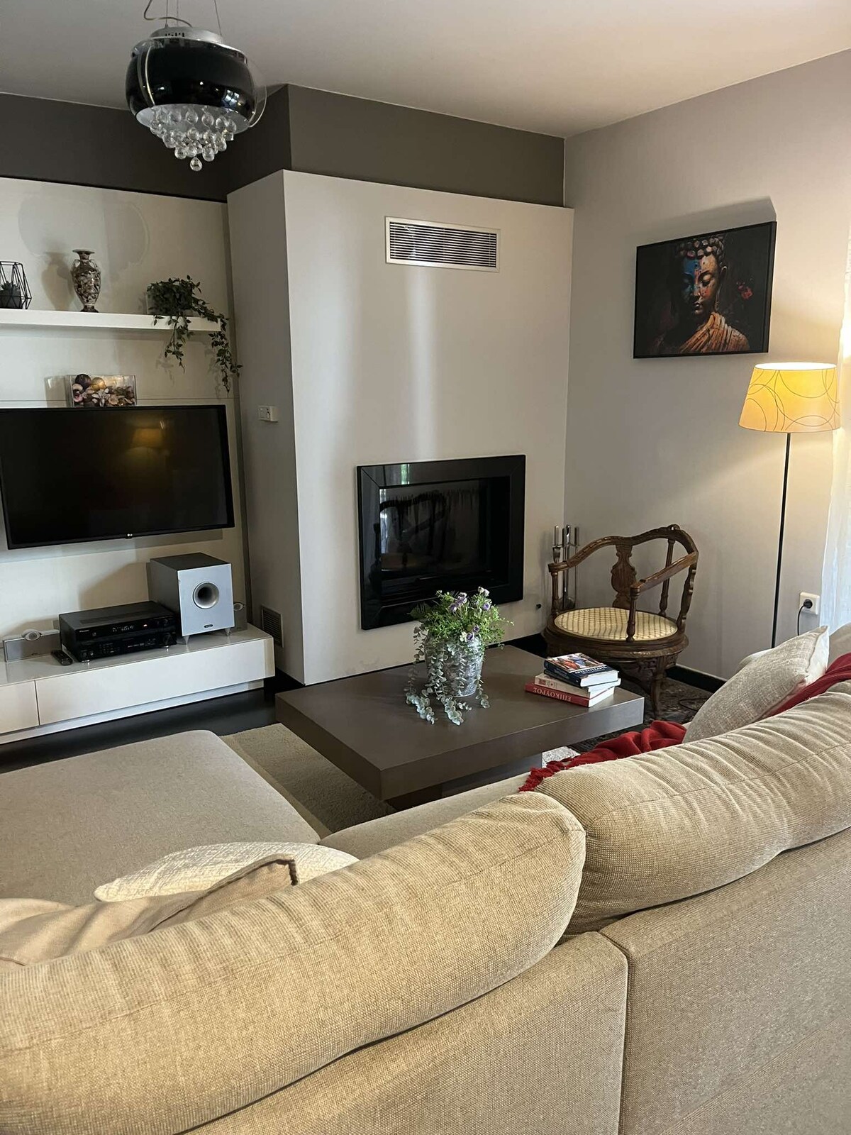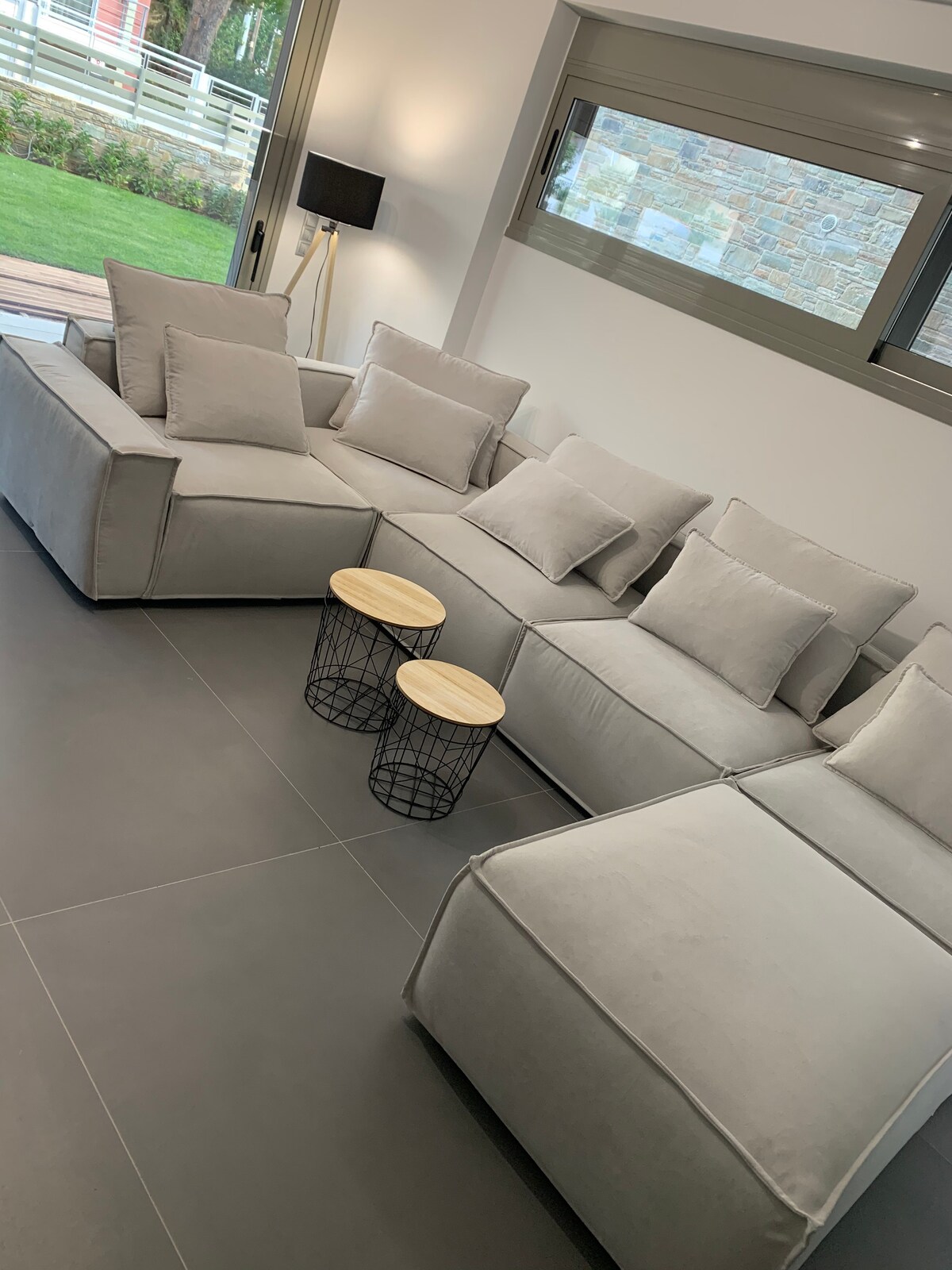 The living area is an open space full of light with a dining area and a fully equipped kitchen. Entertainment, work, relaxation and romantic atmosphere meet here. A desk surface facilitates working on spot, a 43’’inch Smart TV offers connection to your game console, lights create a special atmosphere for dining and relaxing. The living room gives exit to a balcony overlooking the basketball court. This is an ideal spot for early morning relaxation and lazy afternoons.