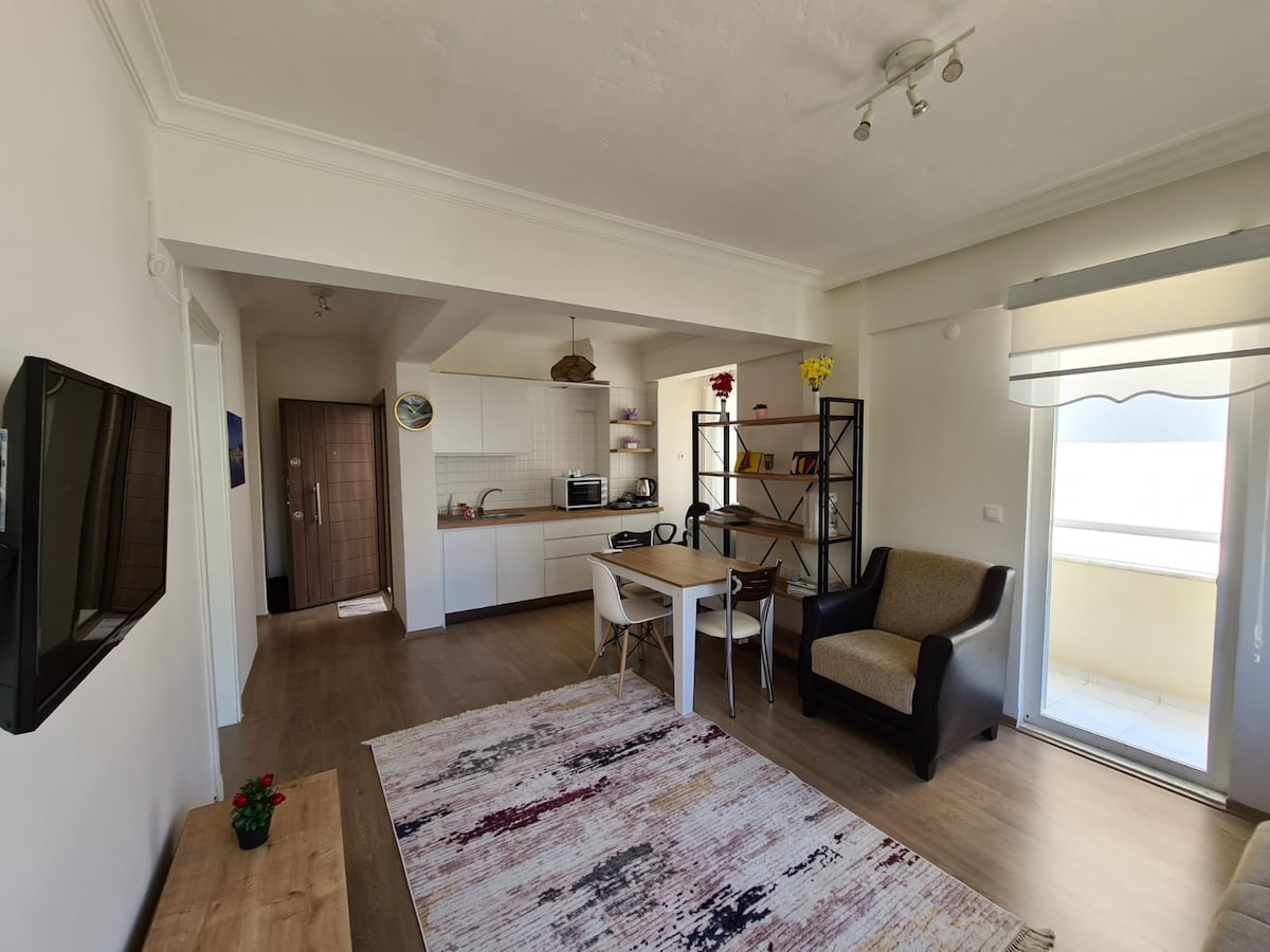 This Cozy 2+1 is located in center of Marmaris. In the house there are all you need. Coffee machine, teapot, microvawe oven, WM, dishwasher, two TV sets etc. All the rooms has air conditioner. Apartment located on the seaside. There is public beach across the street. On the mainroad 15 minutes parking is free. You can easily find free parking place around three parallel roads far from the sea. It means five minutes walking distance.