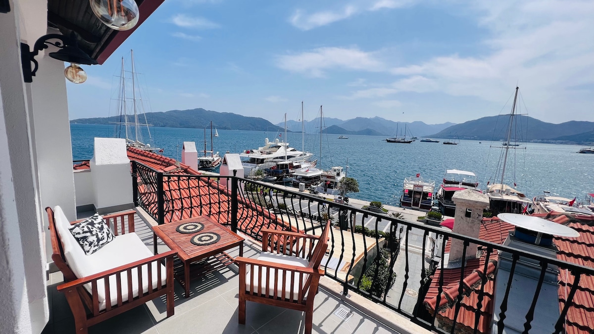 A unique mansion house with 360 degree sea, trees, castle view in Marmaris Marina Our home; It is located in the center of all amenities in the marina area, restaurants etc. In the marina area of ​​Marmaris, Restaurant Cafe Market, Gift Boutiques and Our House are next to each other, and enjoy your holiday with a barbecue on our lower balcony or on the Terrace.