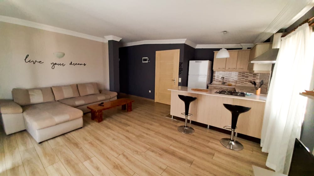 70 m² olan bu oda, iki yatak odası, bir salon ve bir mutfaktan oluşmaktadır. Panaromik deniz manzarasının yanı sıra otelin arka bahçesini de cephe alan 3 balkonu bulunmaktadır. 2020 yılında özenle hazırlanmış bu daire, misafirlerimize hem yaz hem de kış aylarında mükemmel bir konfor sağlamaktadır.