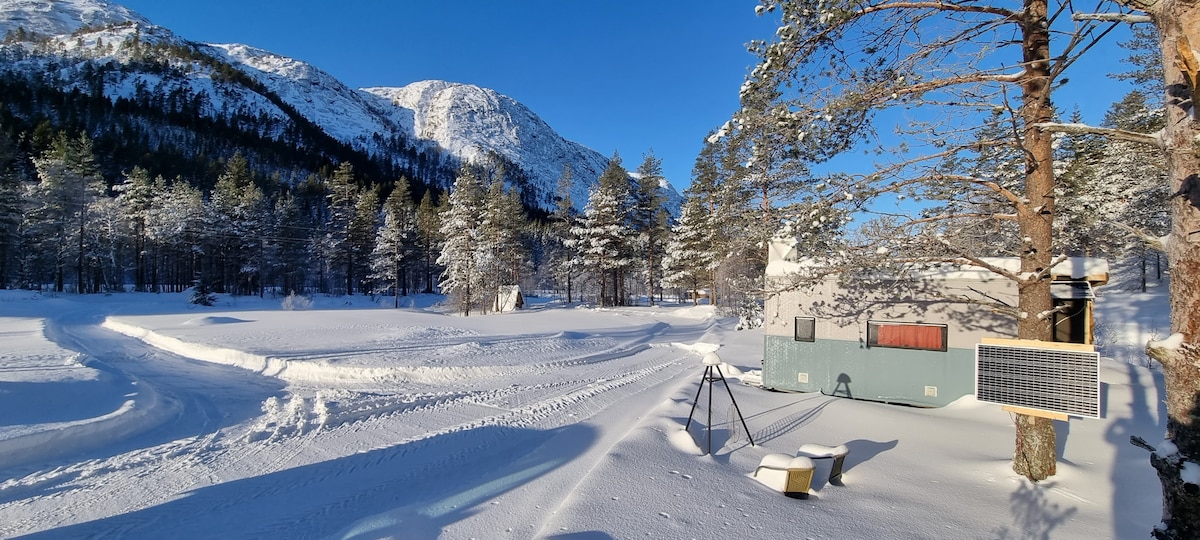 Liten hyttevogn med vedovn ved siden av en liten elv/bekk. Naturskjønt beliggenhet. Vogn har solcellepanel til lys og vedovn til oppvarming. Bålplass utenfor. Mulighet også å leie badestamp og tønnebadstue / sauna mot ekstra betaling. I sauna kan du vaske deg med varmt vann. Robåt til gratis lån. Plassen passer fint til dem som liker seg I naturen med enkel standard overnatting. I høst/ vintertid fra ca 15.9 - 1.5 er vogna sammen med eget privat ute-kjøkken. Hund tillatt