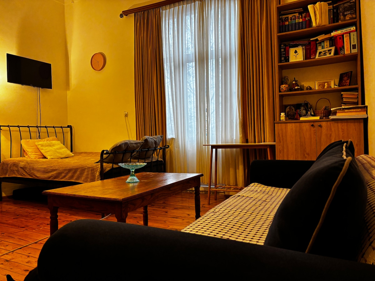 Sunny & Cozy Studio Home - Rustavi Bright and comfortable stay in this cozy studio apartment located in the heart of Old Rustavi. Perfect for couples or solo travelers, the apartment offers everything you need for a relaxing and convenient stay. The space features a comfortable double bed for two guests, a fully equipped kitchenette, and a cozy seating area with a sofa and coffee table, ideal for relaxing or working remotely. A perfect choice for a peaceful stay with easy access to the city.
