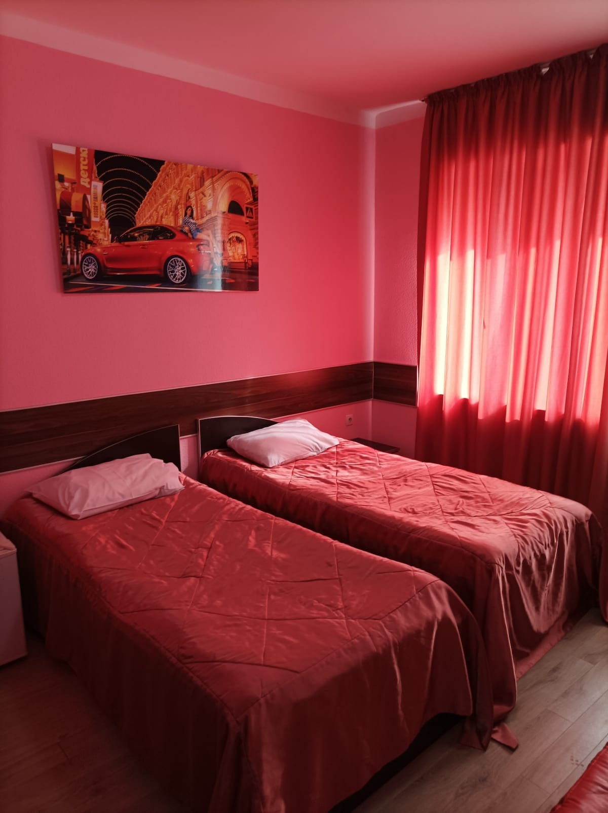 A separate room (20 m2). With a bed-sofa and a crib, computer table, closet. Location: Rustavi is a quiet yet very sufficient city located near Tbilisi. There’s everything you need: chain supermarkets; hypermarket; a huge park with a lake, ancient fortress and surrounded by mountains; an open local market (bazaar); funicular; forest. The mini bus stop to the capital Tbilisi is right in front of the house. It takes 30 minutes to get to Tbilisi from Rustavi.