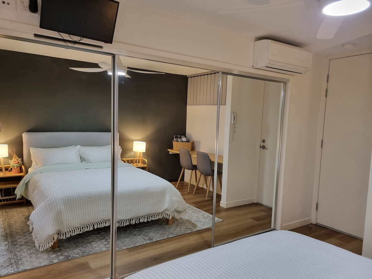 Our conveniently located studio apartment is just 10 minutes from the beautiful Maroochydore and Mooloolaba beaches. Enjoy a well-appointed private and cozy air-conditioned space including a 55" smart TV with Netfix, gigabit internet, and a work desk. Your own bathroom, kitchenette and private patio with BBQ. Washing machine, ironing board, and secure parking, suitable for Caravans and Motor Homes. Our Sunny Studio is the perfect base to explore surrounding beaches, local dining and shopping.