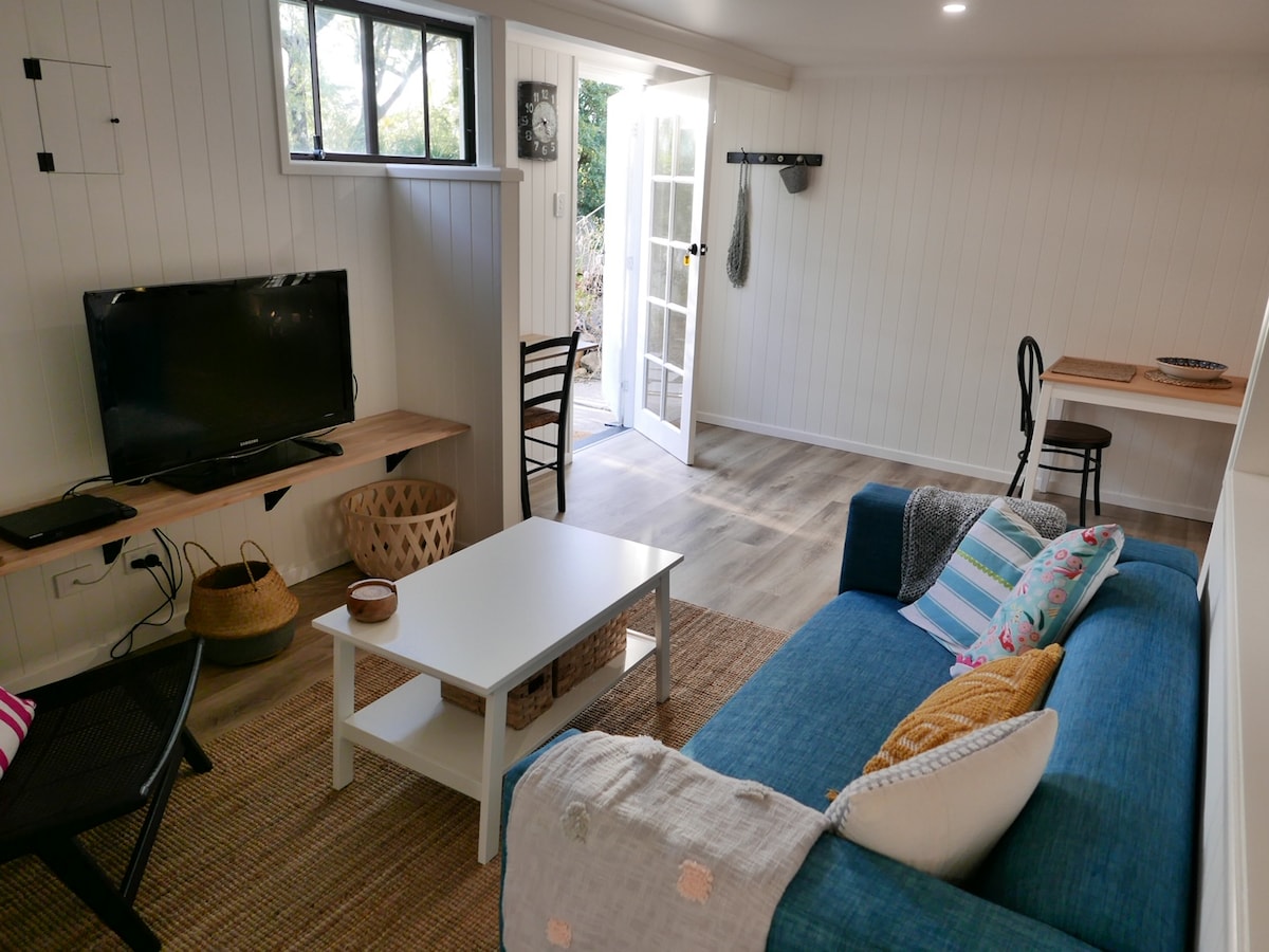 Our private Guest House is just a short stroll from beautiful Mudjimba beach offering you a relaxing romantic getaway or a creative space to work. One bedroom with Queen bed, desk, crisp linen, comfortable lounge, TV, dining area and window seat. A full kitchen includes a coffee maker, although we highly recommend the local cafes and restaurants which are an easy walk away. I would love to host you in our Guest House - you can send me a message with any questions that you may have.