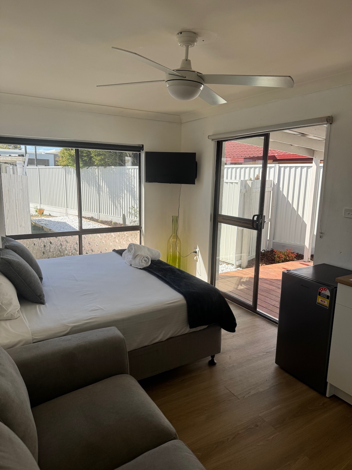 The Studio is a Bright, clean, airy and stylishly decorated 1 bedroom studio apartment on the lower level of our home, two steps up so not disability friendly, ideal for couples, (sorry not child friendly.] There is a well equipped kitchenette, large corner chaise lounge, pillow-topped queen size bed, romantic candlelit bedroom, Reverse cycle air conditioning, WIFI, Large Smart Screen TV with Chromecast streaming device for watching Netflix, Stan or whatever platform you use. Private BBQ