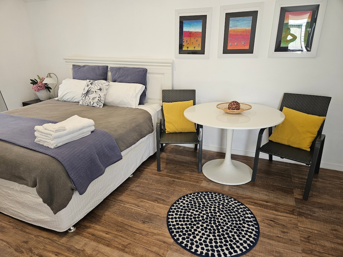 This is a modern boutique studio for single person bookings only. garden views from inside and from the private deck, with a shared pathway from street. BRAND New furniture (2026) + top quality Queen bed ideal for a single traveller that prefers a nature setting studio to a hotel room. Bbque facility available and four eateries ( including an award winning Greek street food) in walking vicinity. Closest beach is five to ten minute drive. International airport 7min drive. Super comfortable bed!