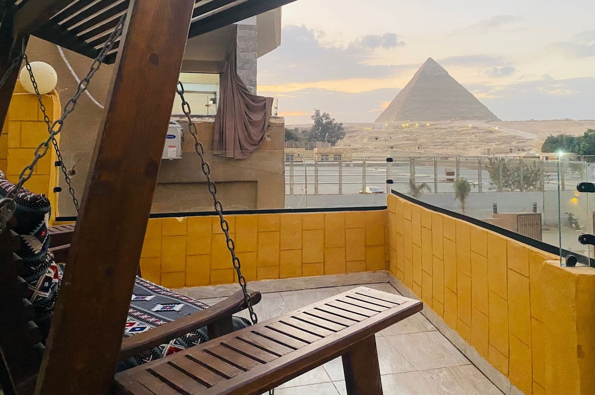 Enjoy your stay with Panoramic View of the giza pyramids and sphinx Yes! view and pictures are all 100% real. (Be sure to check out our other listings too) Indulge in a stunning view of all the Giza Pyramids from anywhere within this contemporary oriental studio or while relaxing in the Jacuzzi. It is also a 10 min walk from the Pyramids entrance gate. To make the most of your trip, make sure to check out our experiences! We're committed to providing our guests the magical hospitality