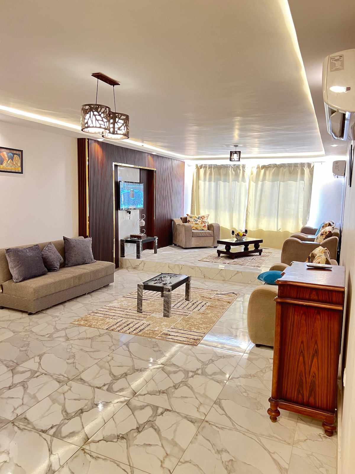 Beautifully designed luxury apartment . Private floor 2400 sq ft . A perfect getaway for family/individuals looking for neat well furnished stay in Ard El Golf- Heliopolis Cairo. A panoramic garden view along with sunshine specious area served with fully air conditioning (cold and heat). Inspired high standard amenities. Welcoming neighborhood. Metro station is 8 mints walking distance, Famous shopping malls and groceries are quite near. All over, nothing is better than a unique safe location.