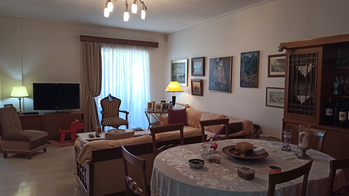 Spacious 75sqm 1st floor apartment with a big balcony, ideally located on “Eirinis Avenue” which is one of the most central streets of the area of “Pefki” . “Pefki” derives from the natural wealth of the area in the characteristic Mediterranean “Pine” tree in Greek “Pefki”. Due to it's climate "Pefki" used to be a resort for the Athenians who lived in the centre. In the neighbourhood you will find supermarket, coffee shops, pharmacies, Greek bakeries, bank, gas station, Greek taverns etc