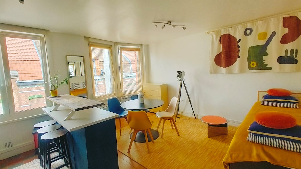 16m² studio adjoining our architect-designed house, located at the end of a private driveway in lush greenery, in the heart of a very quiet residential area. Furnished with taste and sobriety, its independent entrance, its equipped kitchenette, its shower room, its independent WC, Wifi and private parking offer every comfort. The tram located 450m away reaches the center of Lille and its stations within 15 minutes. Sheets, towels, tea towels, shower outlet provided