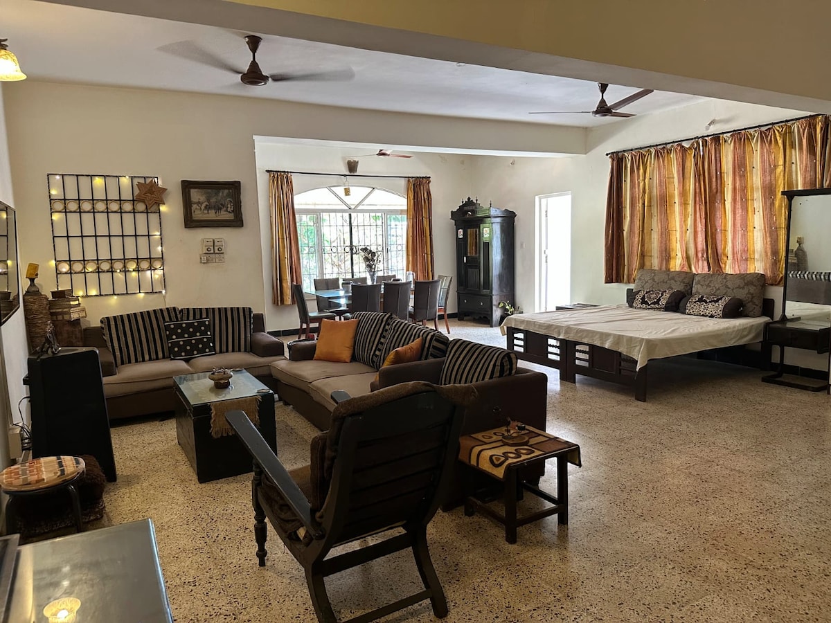 Modern Boho Apartment | Minutes from North Goa's Beaches.A cosy, fully furnished 1BHK retreat perfect for couples, friends, or small families. Highlights: - Stylish boho interiors with a warm vibe - AC in bedroom & living room for comfort - Smart TV + High-speed WiFi - Equipped kitchen with RO water, cooktop, fridge & washing machine - Shared swimming pool (9 AM–6 PM | swimwear mandatory - On-site gym available as a paid facility - 24/7 security for peace of mind - Free Parking