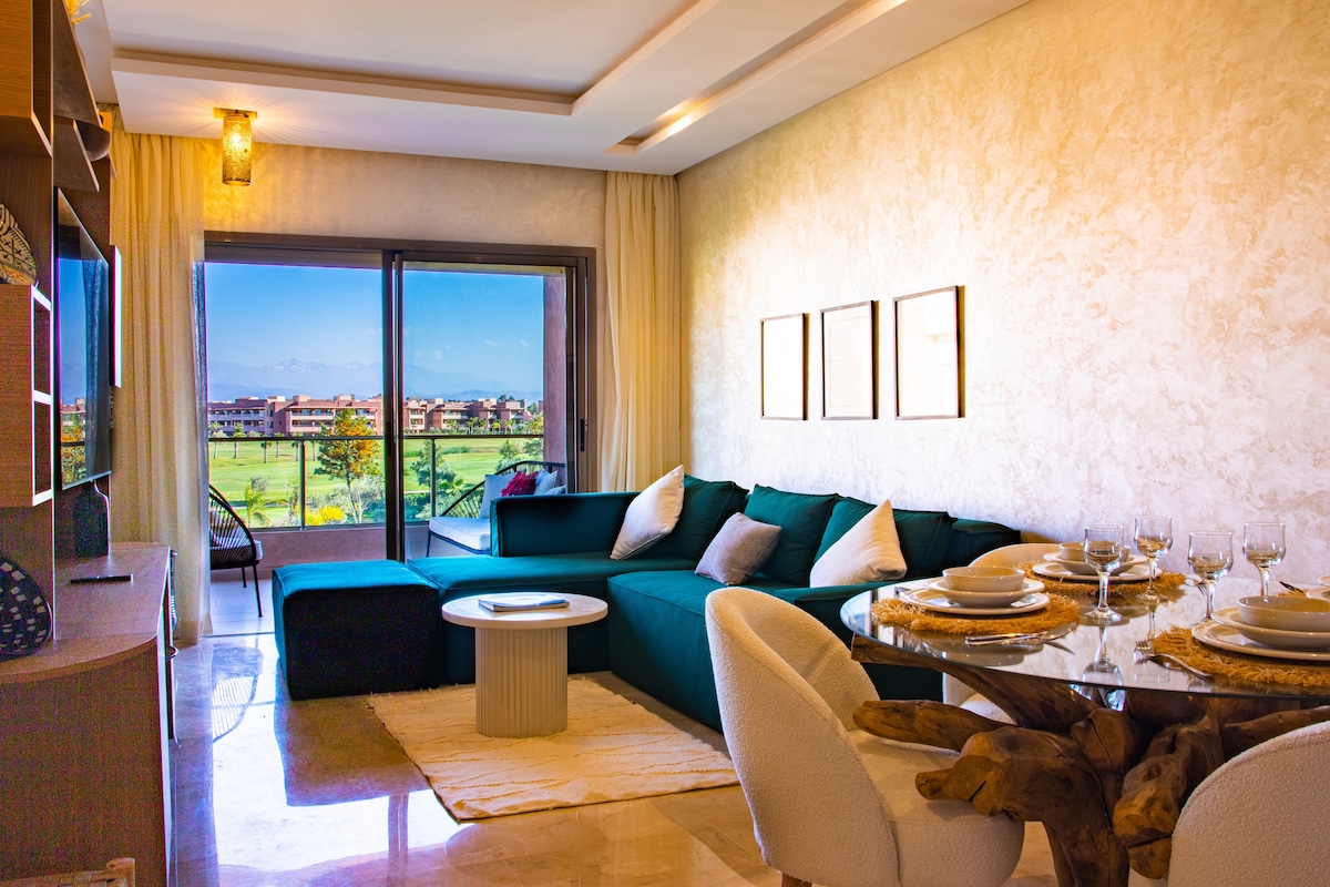 3 Bedroom stylish apartment with a swimming pool in Prestigia Golf Resort right in the city center. Niched in a perfect location, very close to the airport, and only a few minutes away from the Medina, the Mamounia and M Avenue. Enjoy large smart TV for Netflix, comfortable bedding and amazing views on the golf overlooking the Atlas Mountains. The apartment is inside a golf residence with security, a club house, swimming pools and a golf course with breathtaking views of the Atlas Mountains.