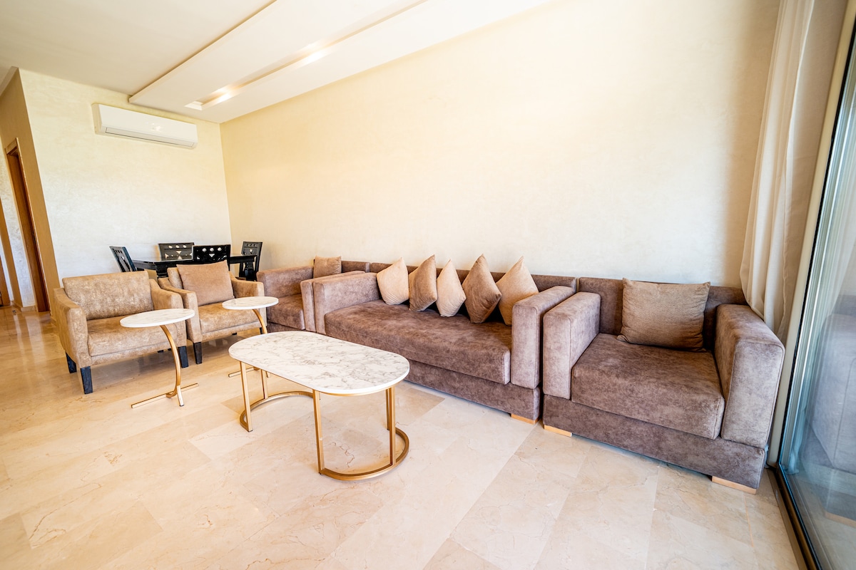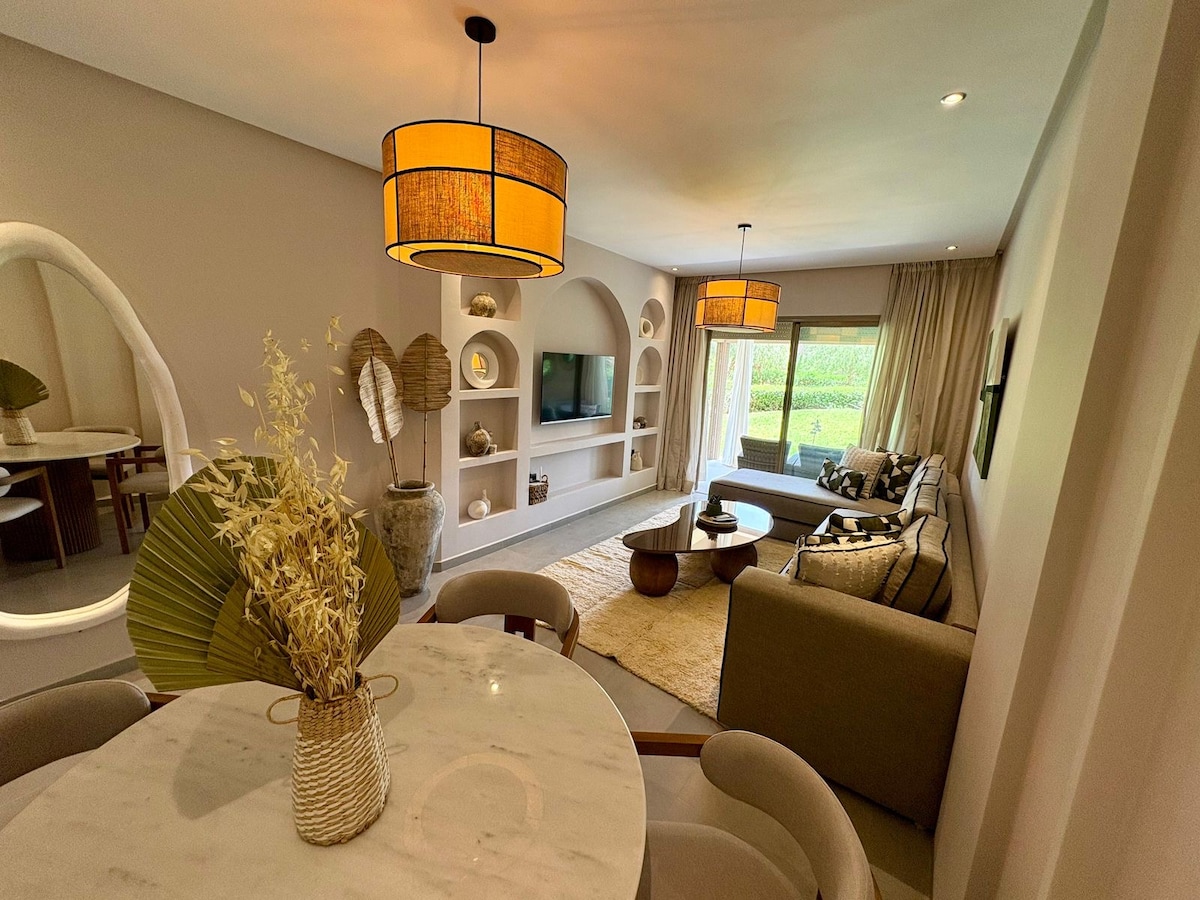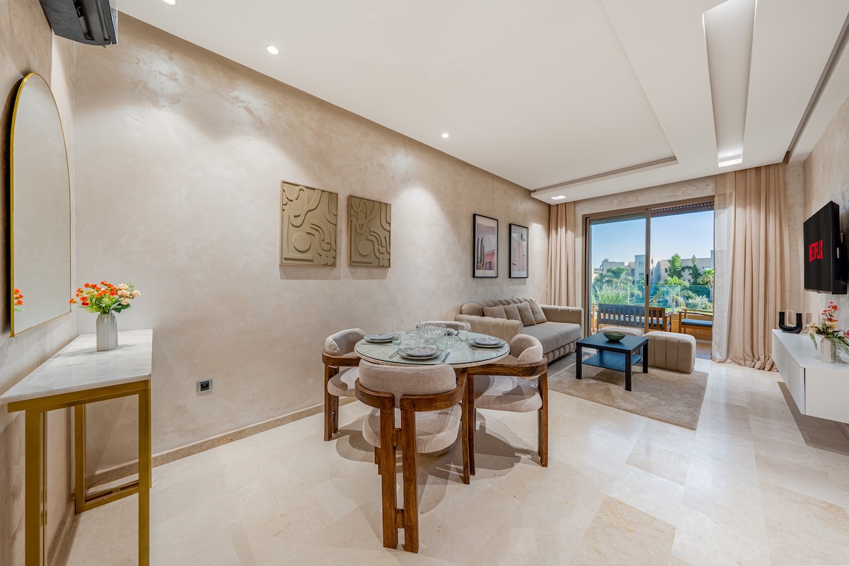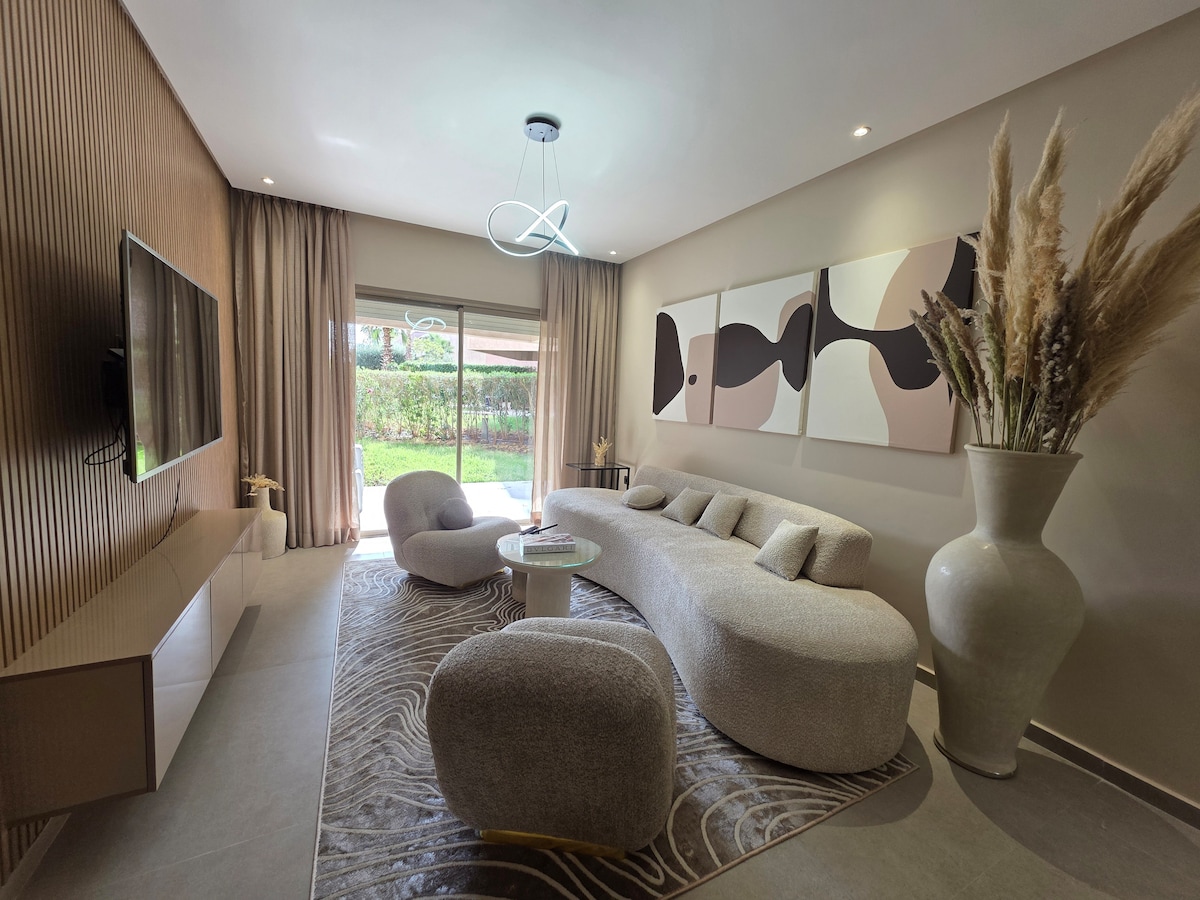Profitez de ce magnifique appartement moderne et décoré avec style par l'artiste Marocain NICH, situé au coeur de la résidence sécurisé Prestigia avec piscine et parking . 2 chambres, 2 sdb, grand salon, Smart TV, fibre, Netflix. Serviettes, shampoing, gel douche sont fournis. Femme de ménage dispo (sur demande). À 3 min du restaurant et bar Montgommery du golf, à 10 min en voiture de l’aéroport, Menara Mall, Hivernage, Mazar, et à 15 min de la Médina/Guéliz. Vue sublime, calme et confort