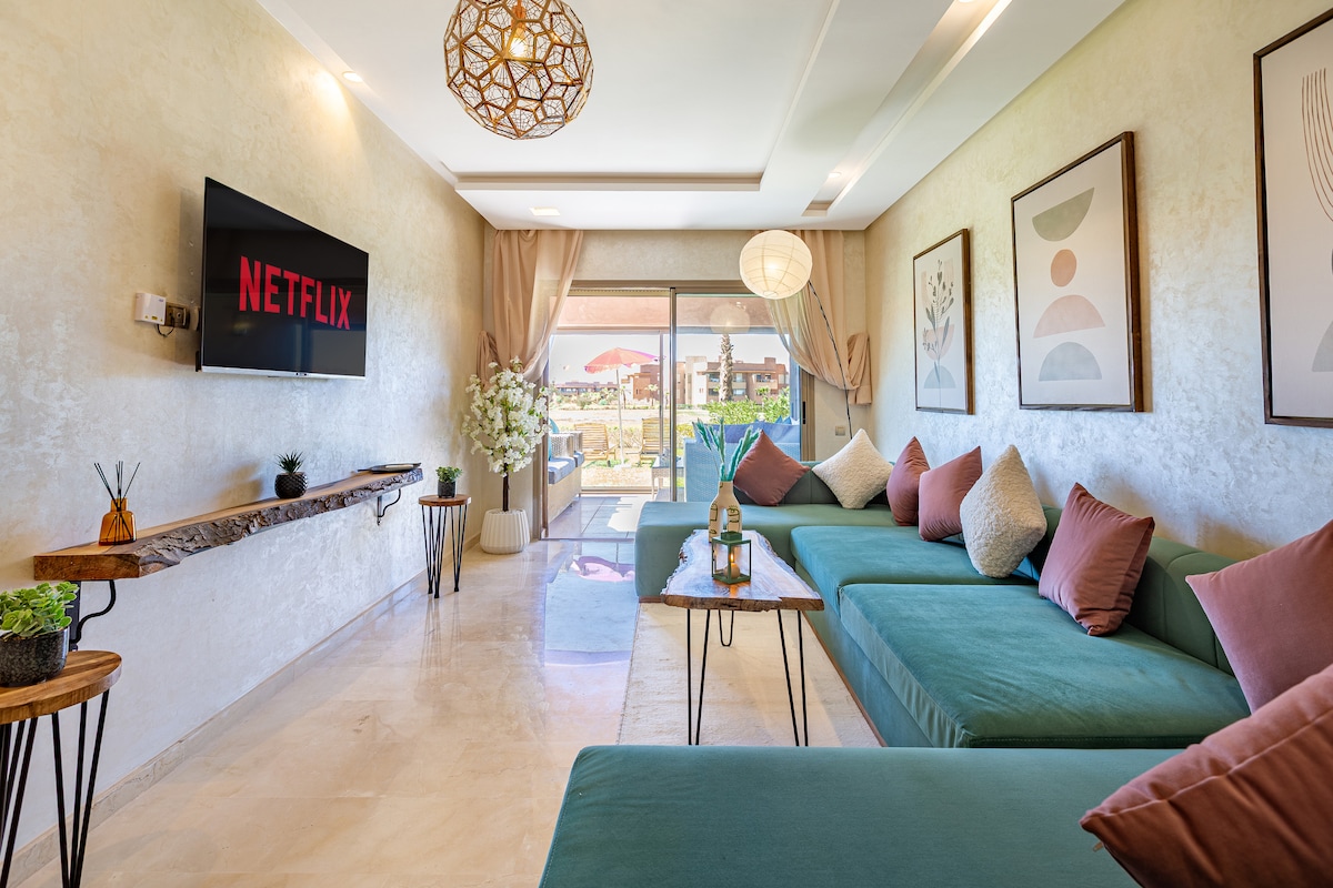 Charming 2-bedroom ground-floor apartment in Marrakech's Prestigia. Spacious private garden perfect for relaxing, just steps from the pool and the Golf. The bright living area opens to the garden, and the modern kitchen is fully equipped. Secure residence, close to Marrakech's vibrant attractions. Perfect for a serene getaway or a base to explore the city. In accordance with residency rules, unmarried Moroccan couples are not allowed