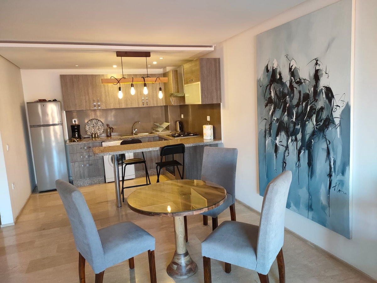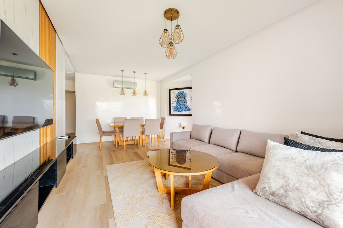 Appartement ensoleillé, chaleureux et hors pair, idéalement situé dans une résidence neuve en plein coeur du quartier mythique, Guéliz, avec une vue sur le Mall Carré Eden, très bien asservi et proche de toutes commodités. Moderne avec une touche marocaine, il est aménagé pour que vous vous sentiez chez vous, c'est le point de départ idéal pour profiter des merveilles de Marrakech ainsi que pour y séjourner pour un voyage d'affaire. Il est également parfaitement adéquat au télétravail.