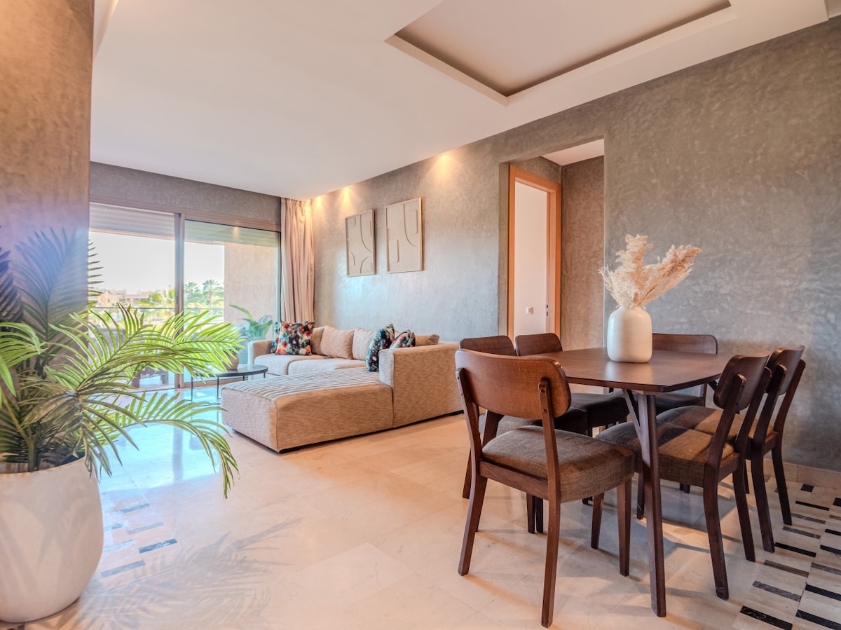 Niché au cœur du prestigieux domaine touristique Marrakech Golf City, découvrez ce luxueux appartement offrant une vue exceptionnelle sur le golf, la piscine et sur les majestueuses montagnes de l'Atlas. L'appartement a été décoré avec amour avec un style moderne, bohème et beldi-chic. Il est entièrement équipé et offre des prestations haut de gamme La résidence est orientée vers les montagnes de l'atlas, elle est très prisé de part son cadre calme et sécurisé et de sa proximité du centre ville