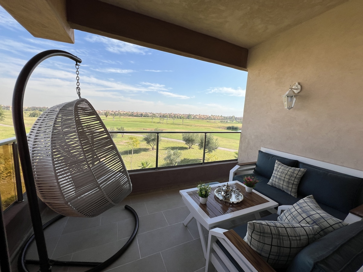 Niché au cœur du prestigieux domaine touristique Marrakech Golf City, découvrez ce luxueux appartement offrant une vue exceptionnelle sur le golf, la piscine et sur les majestueuses montagnes de l'Atlas. L'appartement a été décoré avec amour avec un style moderne, bohème et beldi-chic. Il est entièrement équipé et offre des prestations haut de gamme La résidence est orientée vers les montagnes de l'atlas, elle est très prisé de part son cadre calme et sécurisé et de sa proximité du centre ville