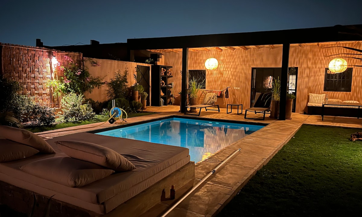 Jasmine_houses_marrakech Villa entièrement rénovée en novembre 2024, pouvant accueillir jusqu'à 4 personnes. Cette villa est parfaite pour passer des vacances à Marrakech. Le logement est décoré avec soin dans un style "bohème chic". Grande pièce à vivre 60 m2 avec cheminée, cuisine équipée, 2 chambres lit queen size, 2 salles de douche et 2 wc. Piscine (non chauffée) et jardin 100% privatif et sans vis-à-vis. Caméra vidéo placée à l'extérieur de la maison pour surveiller l'entrée