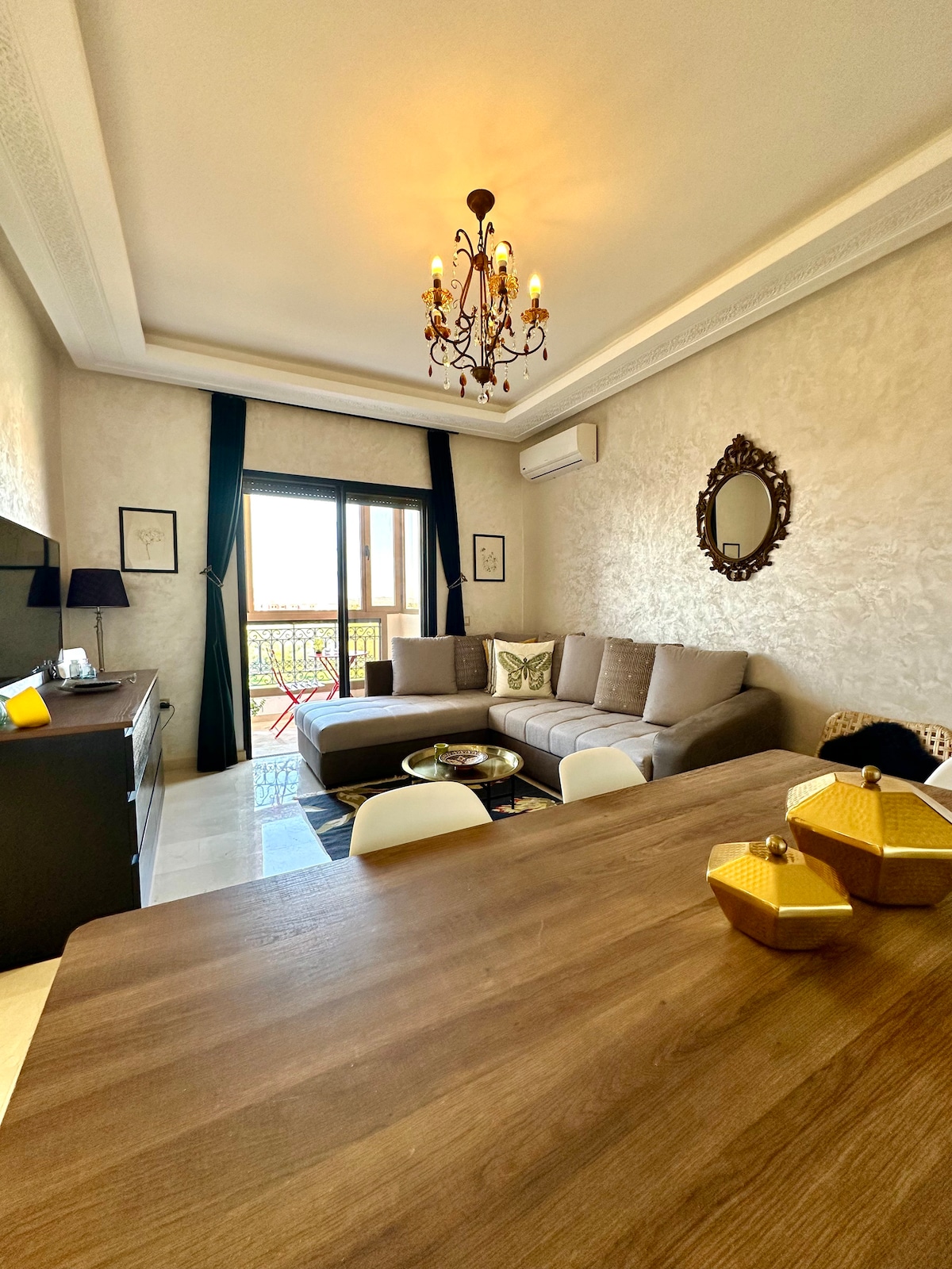 Experience the charm of Marrakech in this stylish apartment, centrally located in the vibrant Hivernage area. A unique blend of traditional craftsmanship and modern comfort, featuring handmade furniture sourced from the Atlas Mountains. Designed by an artist. With a welcoming atmosphere. Whether you’re exploring the nearby cultural attractions or enjoying the vibrant local scene, this well-appointed apartment serves as the perfect base. Enjoy the convenience of staying in the heart of Marrakech