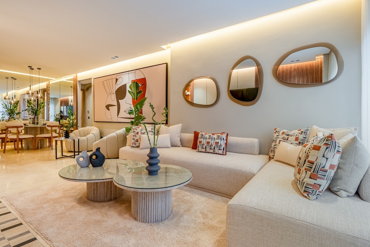 Expérience immersive dans un appartement-galerie contemporaine. Parfaitement situé dans le Triangle d’Or festif, 15 min à pied de la médina. Cet appartement très haut de gamme de 140m2 lumineux et cosy. À deux pas des palaces emblématiques (Mamounia, Sofitel, Casino) Résidence de prestige avec piscine. Idéal jusqu'a 5 voyageurs, il offre 2 chambres, 3 terrasses, 2 salles de bain et 3 WC. Entre ambiance branchée et animée, une expérience unique au cœur de Marrakech vous attend.