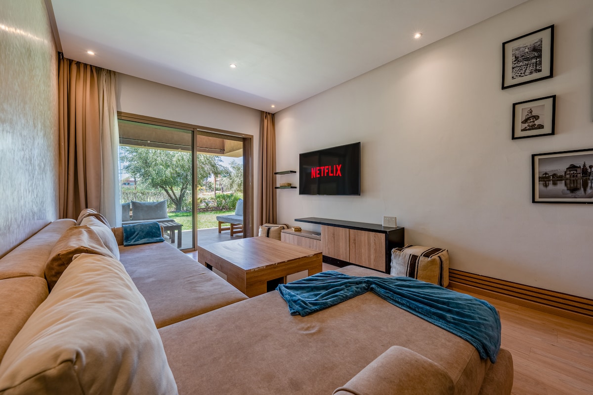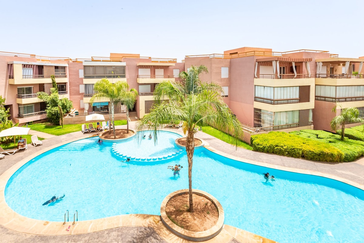 Unforgettable stay in Marrakesh Modern and cozy apartment at Golf Argan Resort, with stunning views of the pool. Gated and secure residence with refined pool, free parking, Wi-Fi and air conditioning. Just 10 minutes from the airport and 15 minutes from downtown Marrakesh. Great for a chic and relaxing stay with family or friends!